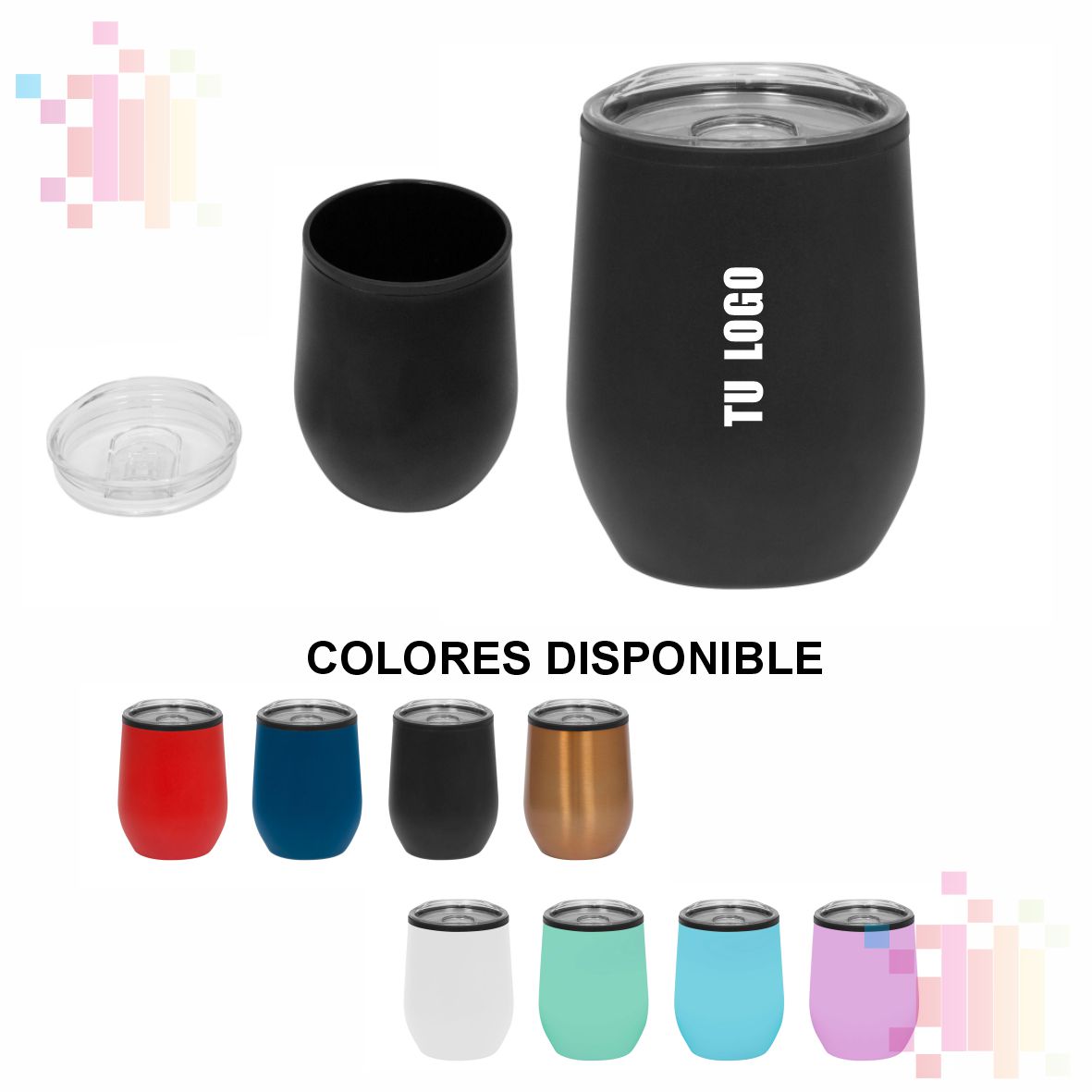T575 – Un Mug “UMA” 350 ml · Ø 8 × 11,5 cm. Doble pared: interior PP, exterior acero 201 Powder Coat: pintura más duradera y resistente. Tapa transparente a presión con anillo de silicona. Base antideslizante. Presentación: caja de regalo