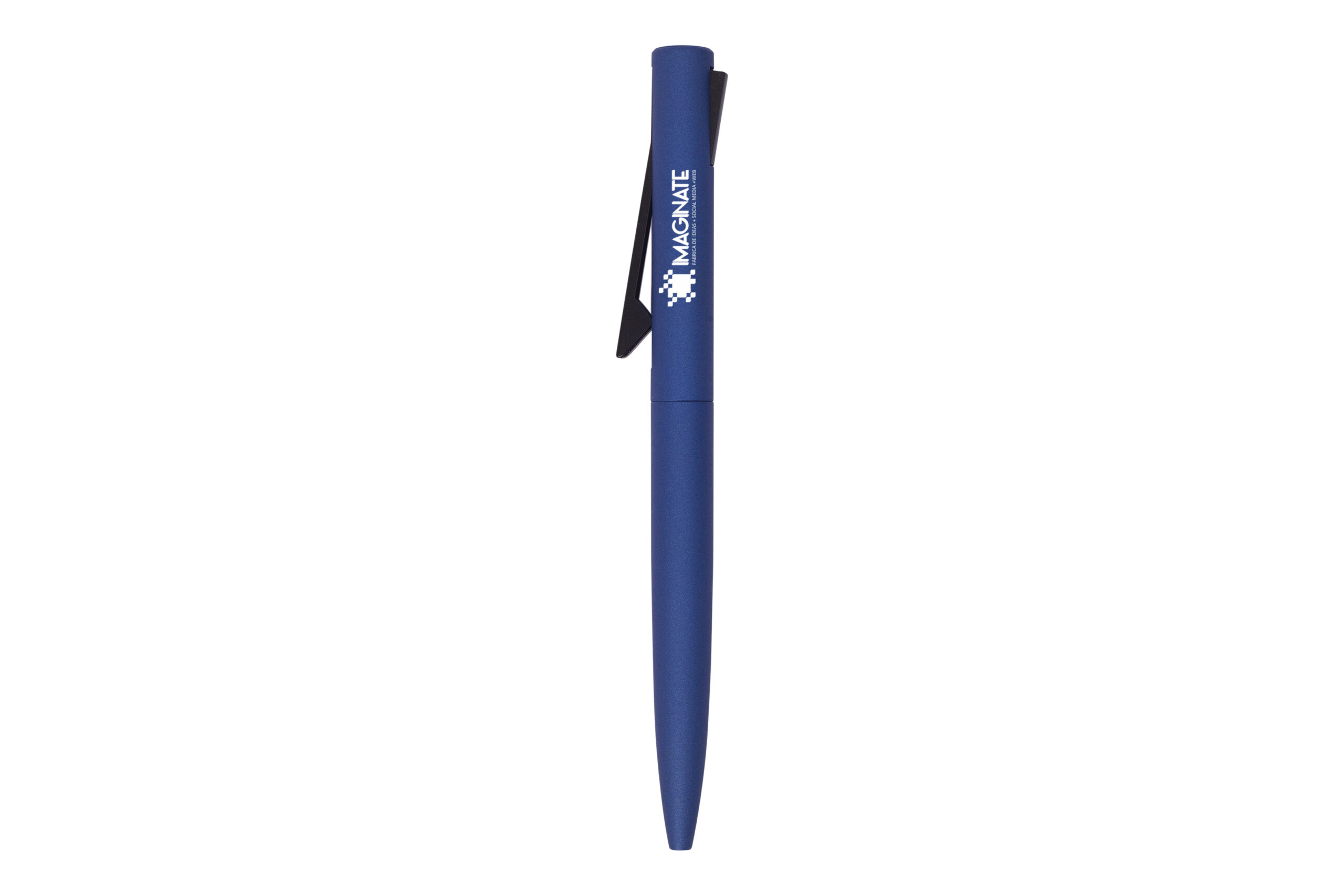 Metal. Cuerpo en metal, parte superior plástica con detalle de color negro. El clip funciona como pulsador. Ideal para imprimir en tampografia. Tinta azul.