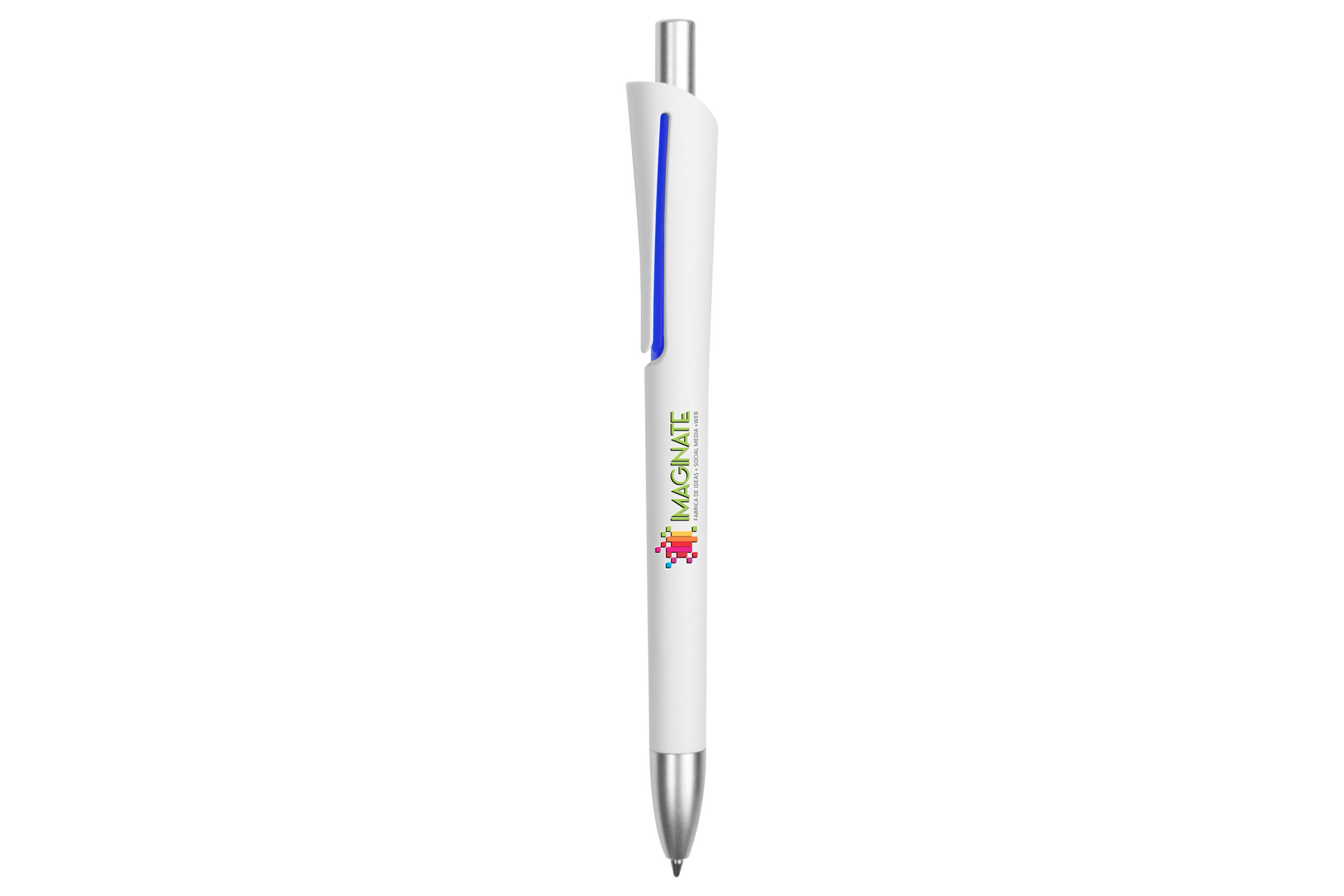 Plástico. Cuerpo blanco mate. Clip, punta y pulsador color plata. Debajo del clip detalle de color. Tinta azul.