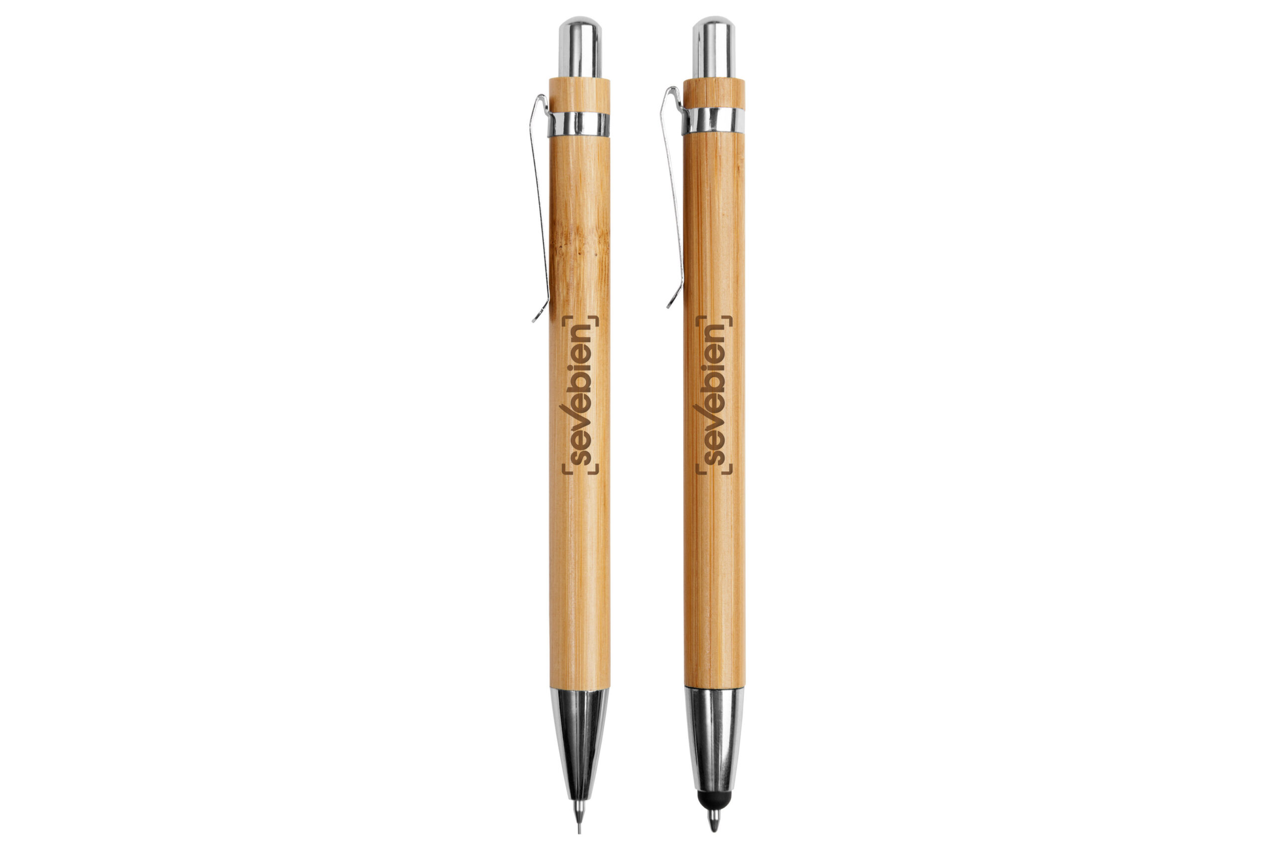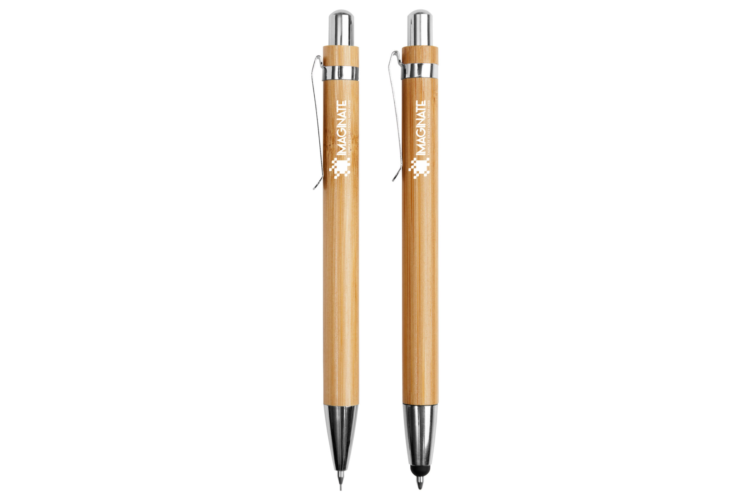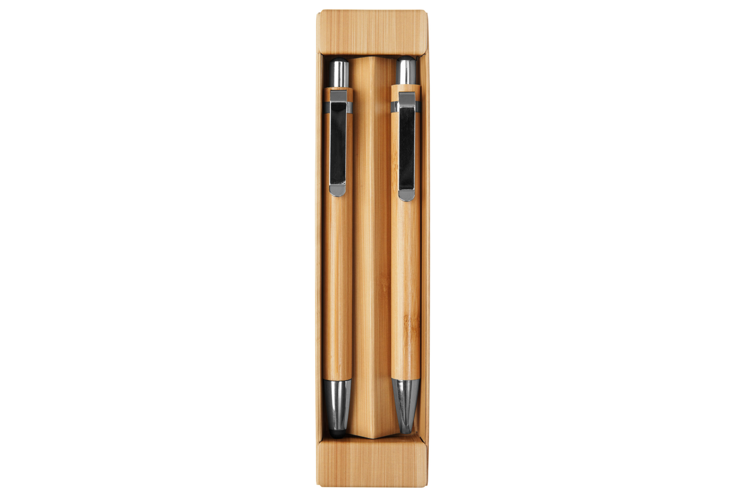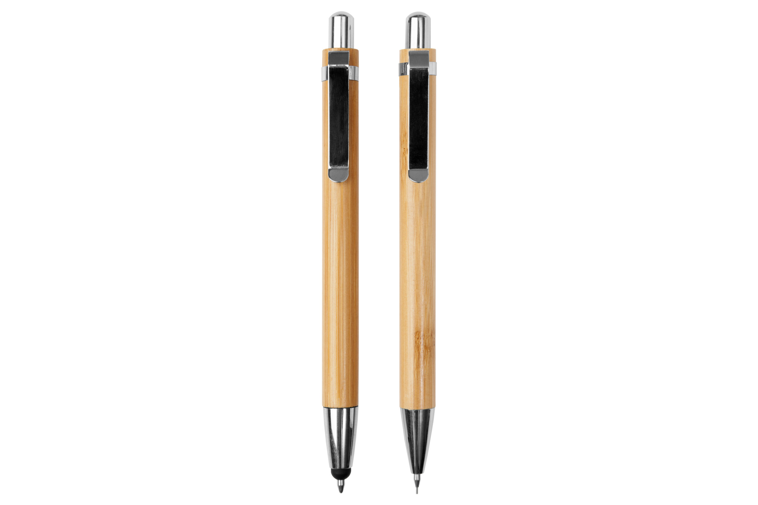 Bambú. Set de bolígrafo y lápiz mecánico. Cuerpo de bambú. Clip metálico. Puntera y pulsador de plástico. Tinta negra. El bolígrafo con puntera touch. En caja de cartón que simula ser madera.
