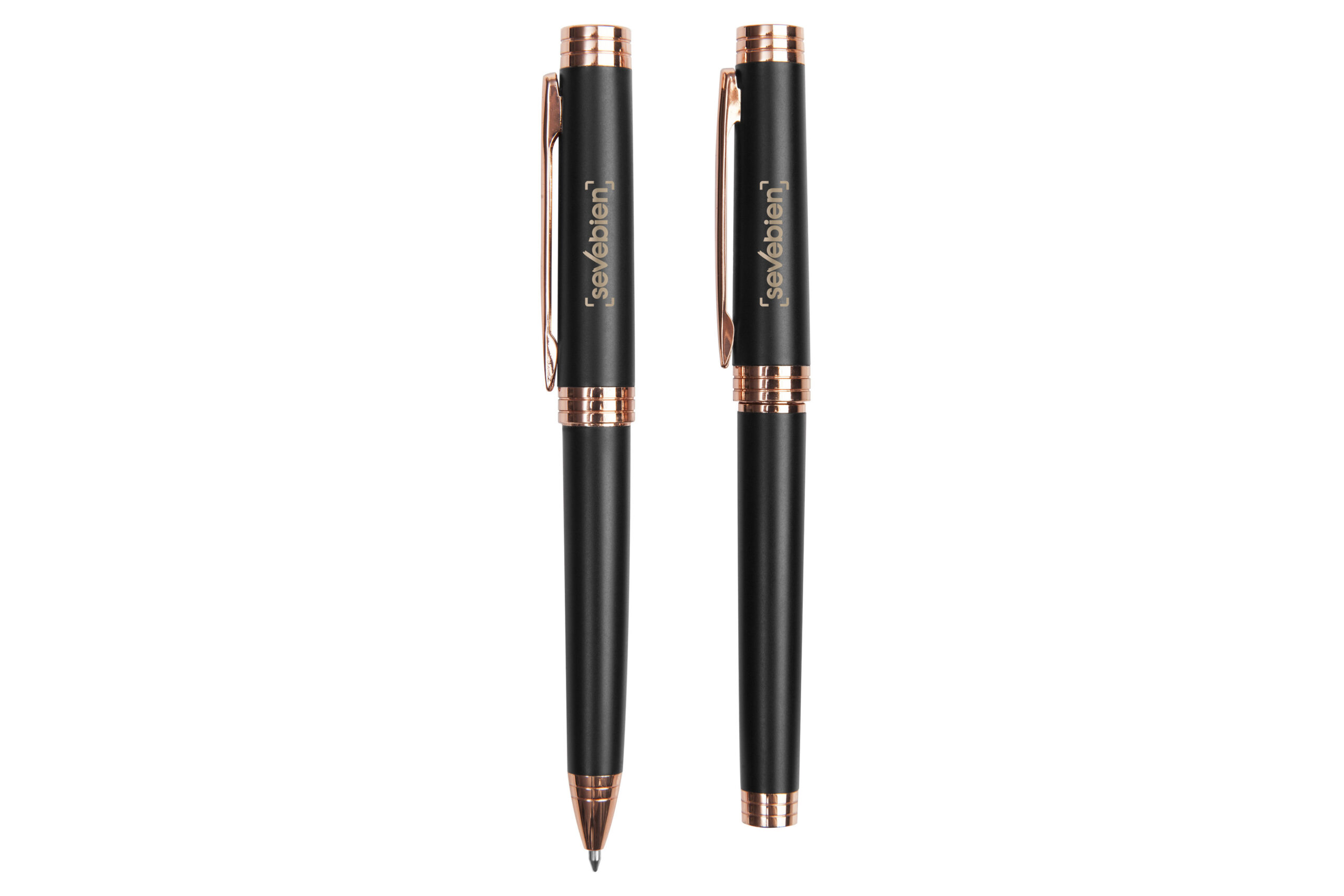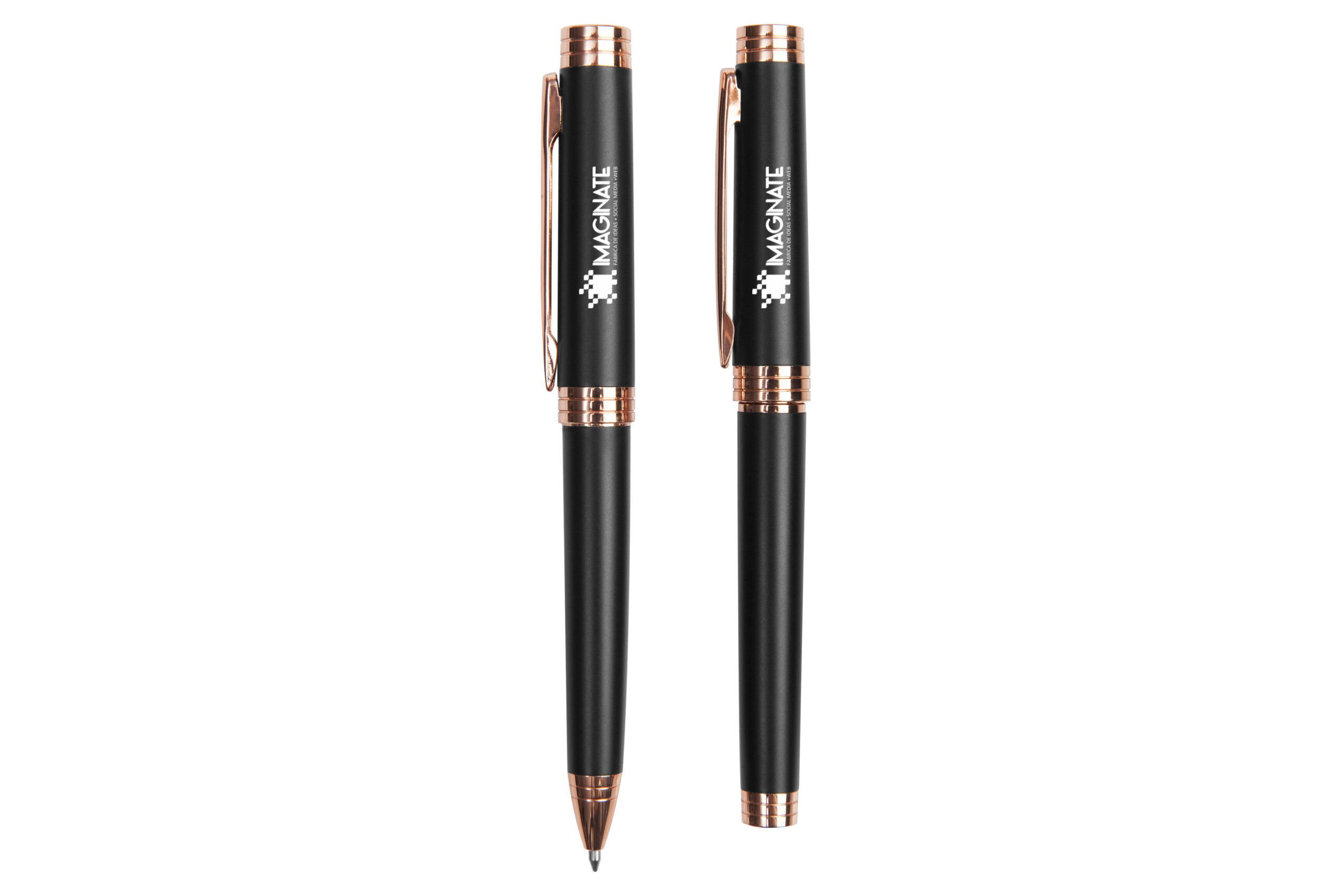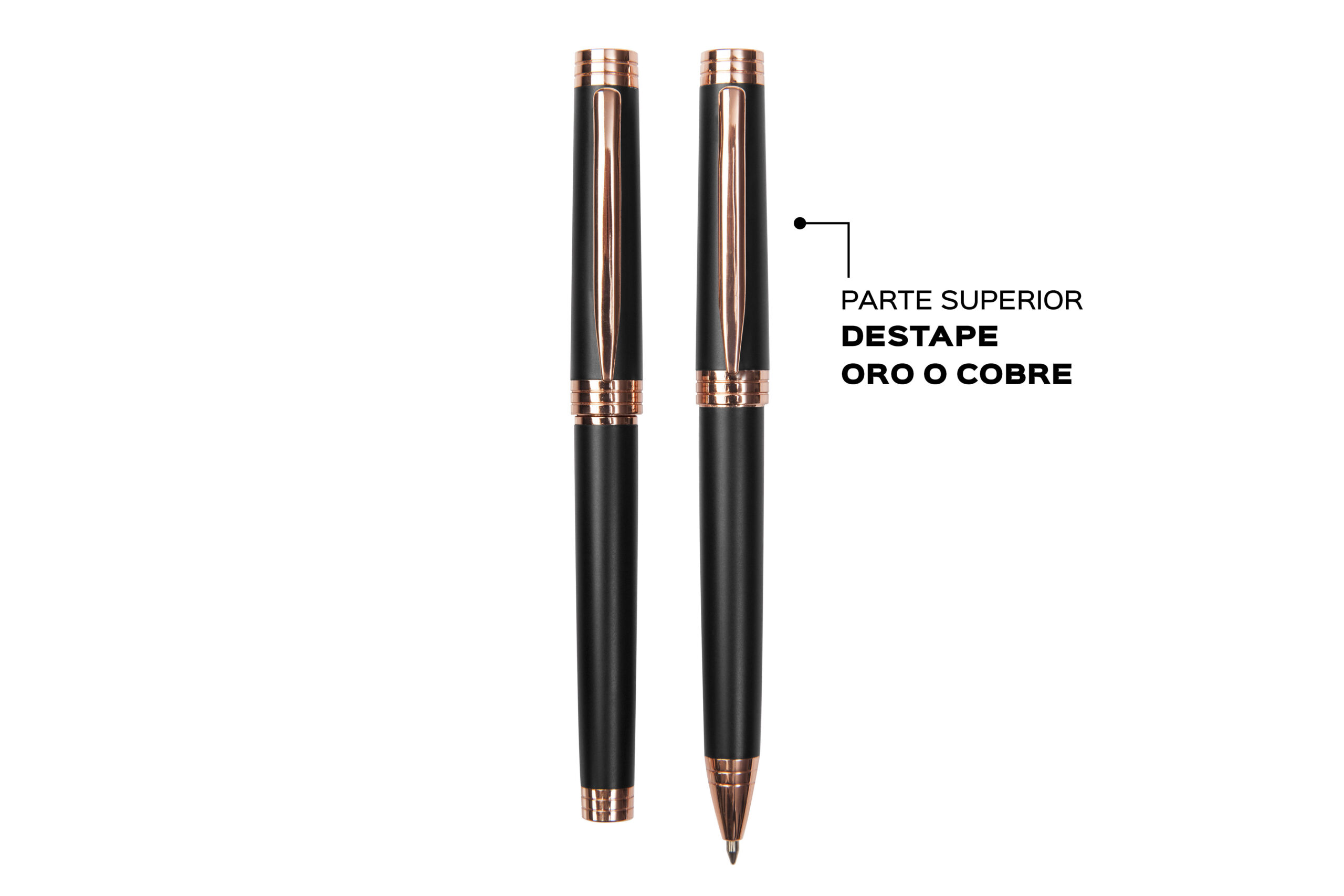 Metal. Set de bolígrafo y Rollerball. Cuerpo negro. Detalles en clip y punta color cobre. Decape electro cobre en la tapa para grabado láser, lo que permite que las letras o logo se vean en color cobre igual a los detalles del producto (grabado exclusivo en nuestro taller). Tinta azul. Presentación en caja de regalo.