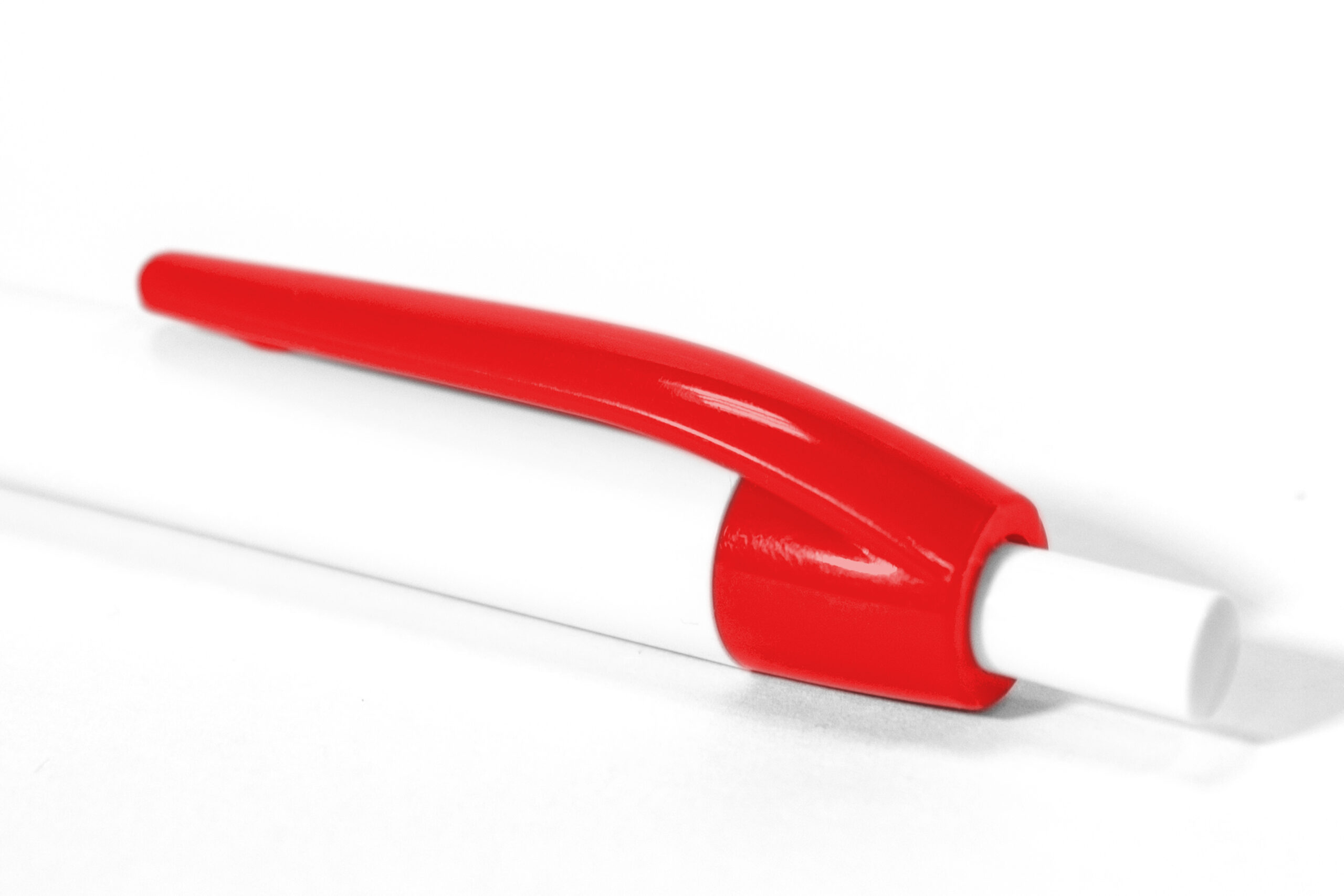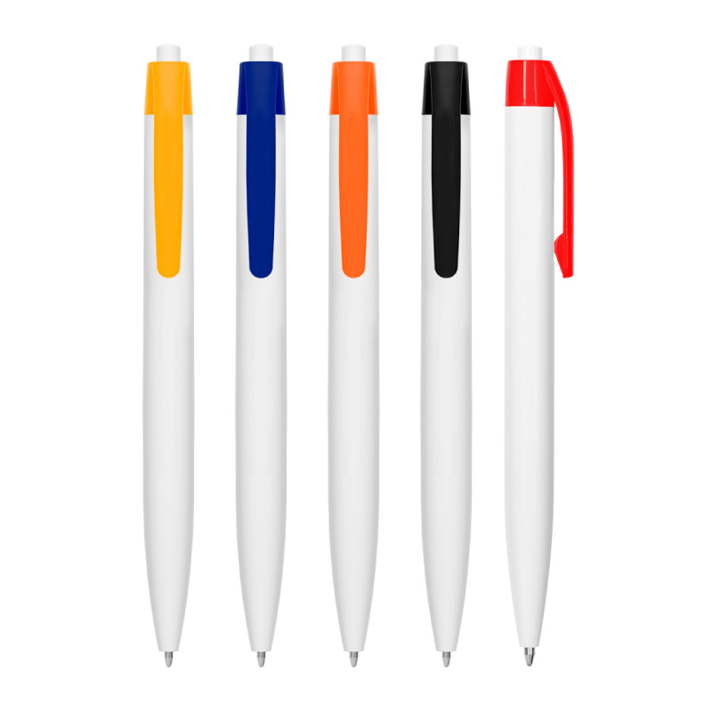 Plástico. Bolígrafo con pulsador. Cuerpo plástico de color blanco y clip de color. Tinta azul