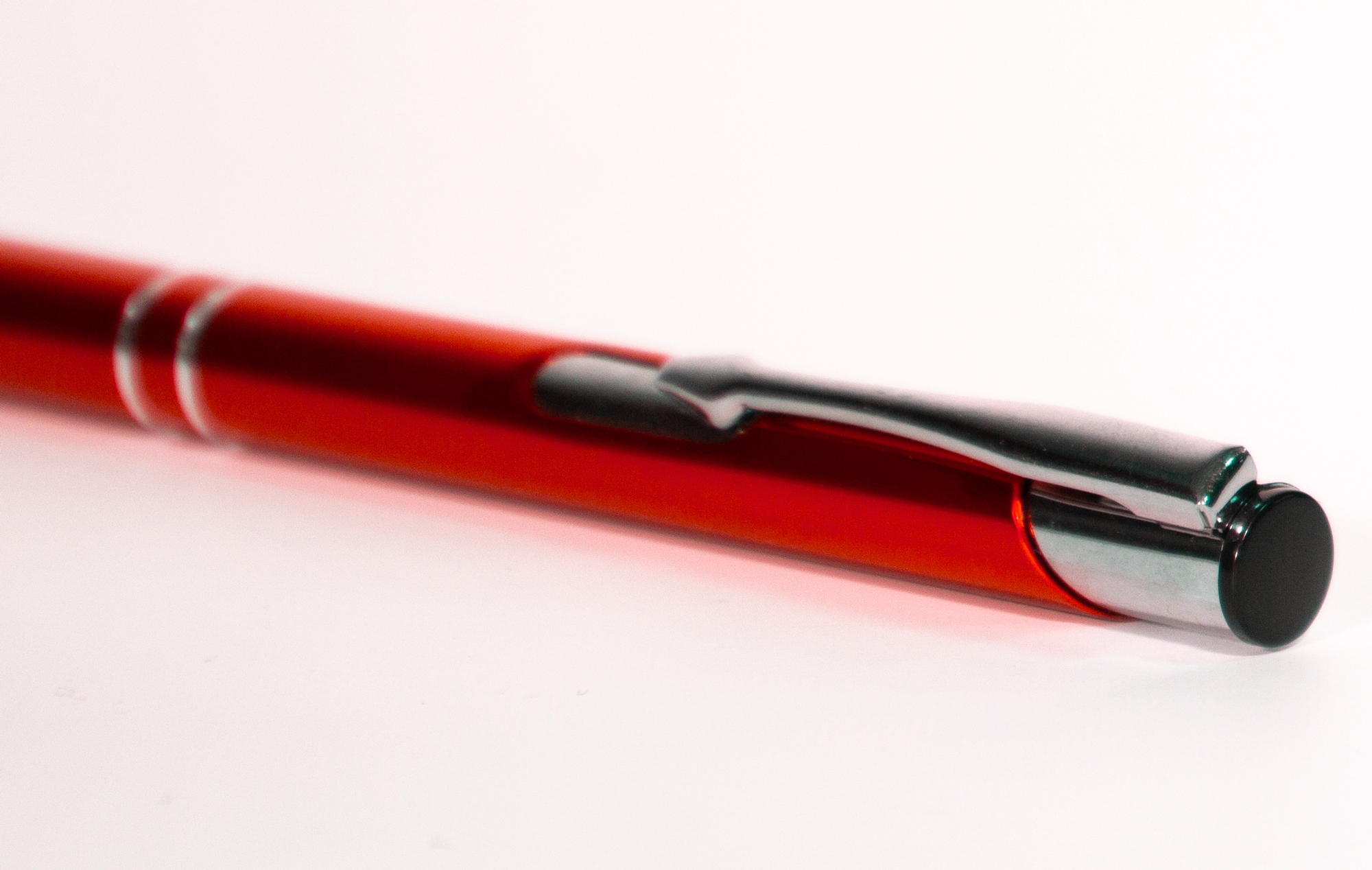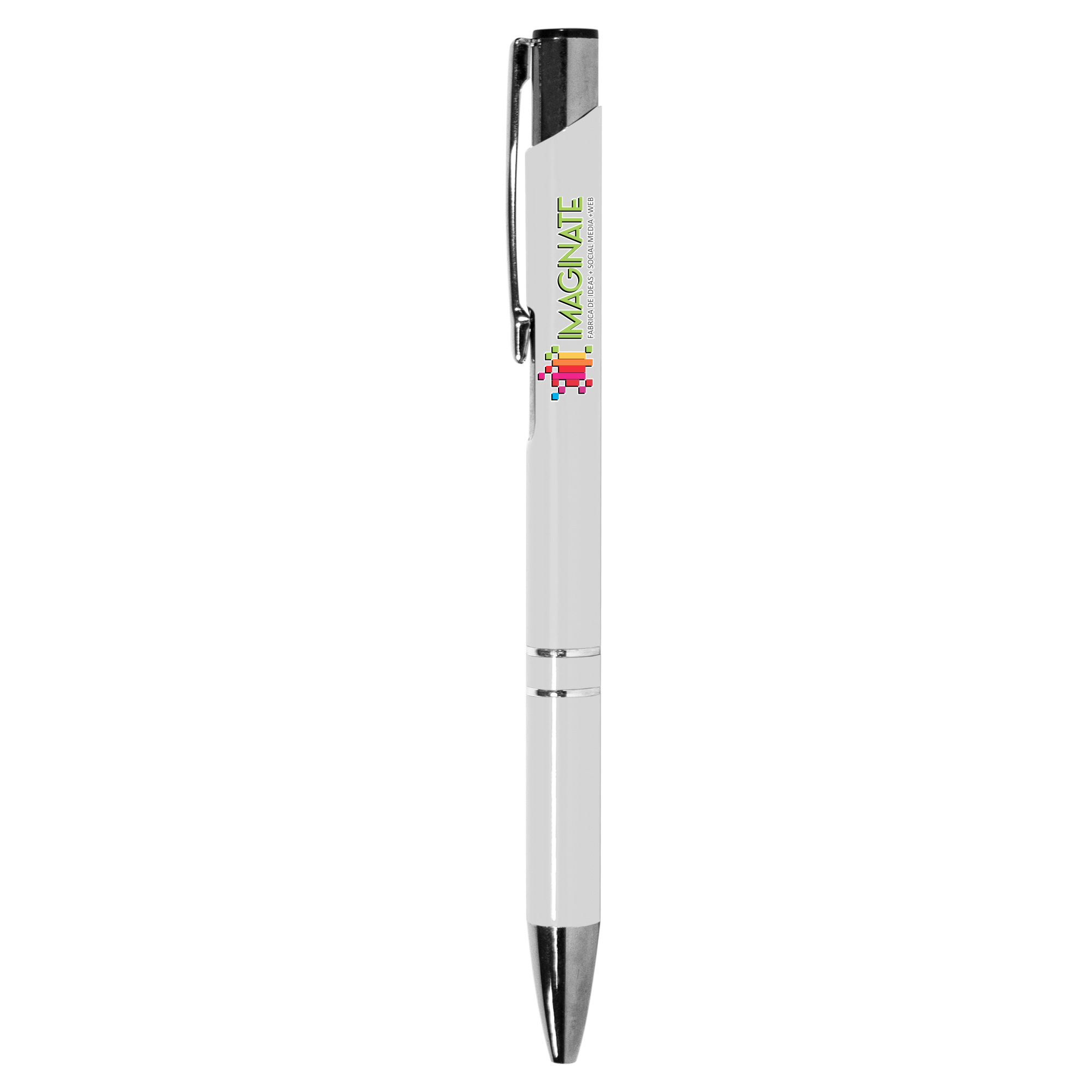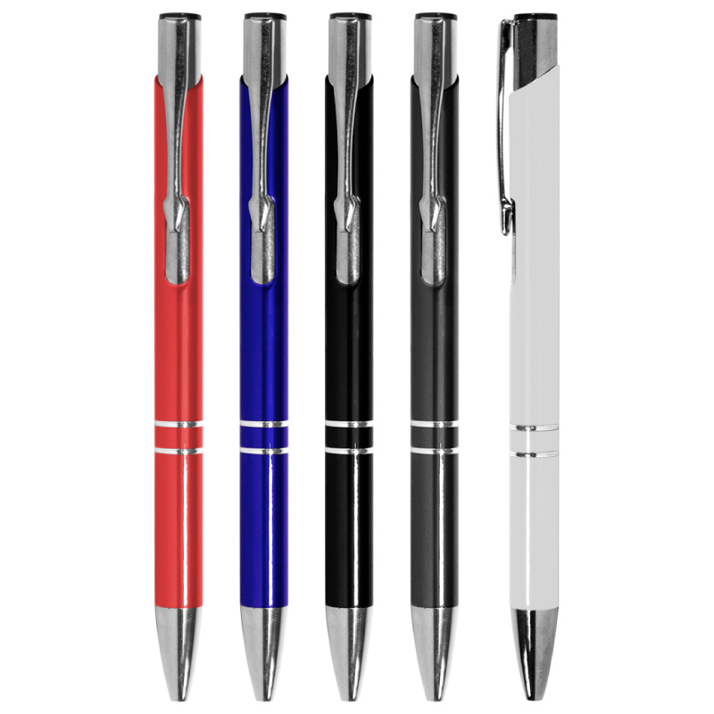 Aluminio. Cuerpo metálico de color. Clip, punta, y pulsador color plata. En el centro del bolígrafo cuenta con dos arandelas y más arriba finalizando el clip cuenta con una muesca color plata. Tinta negra
