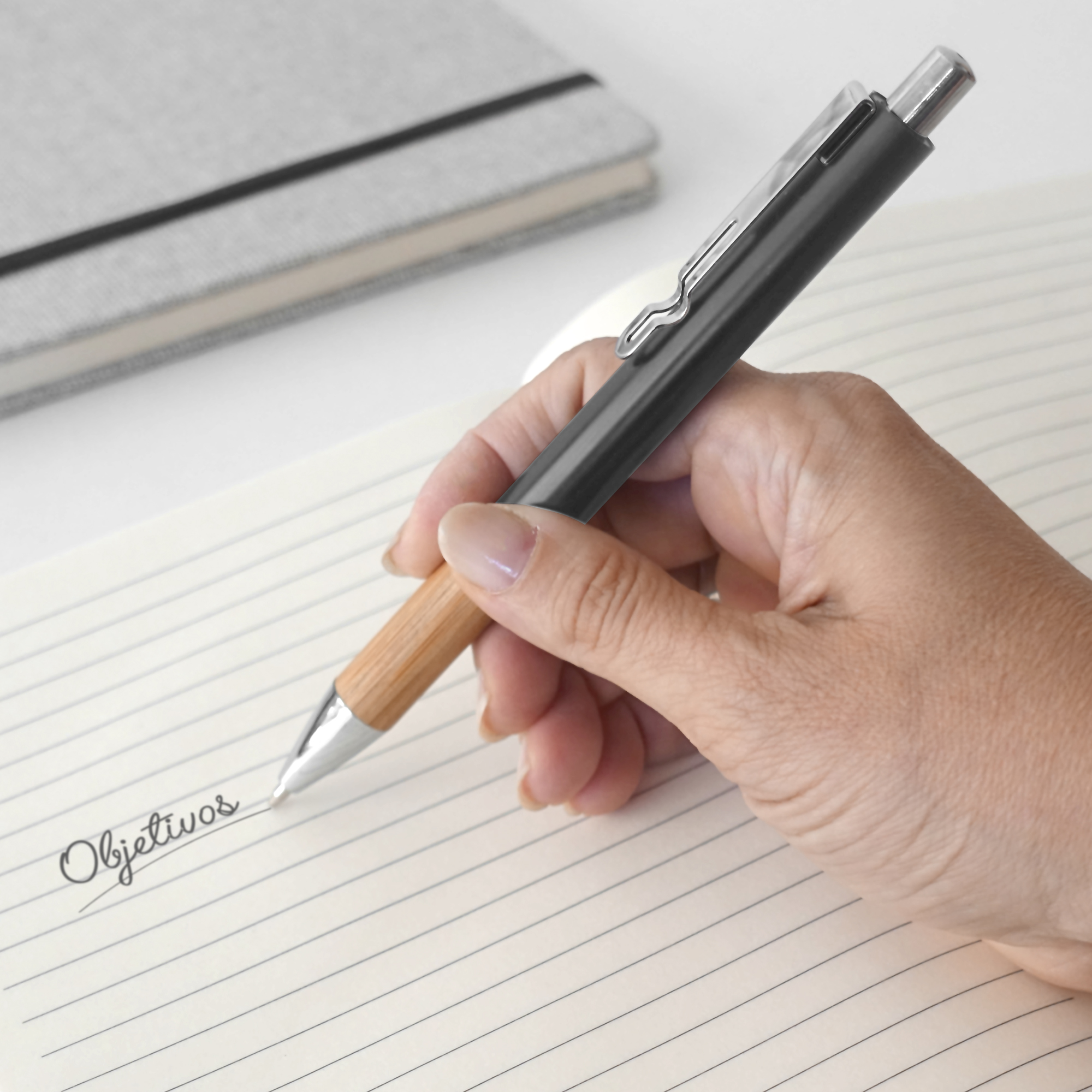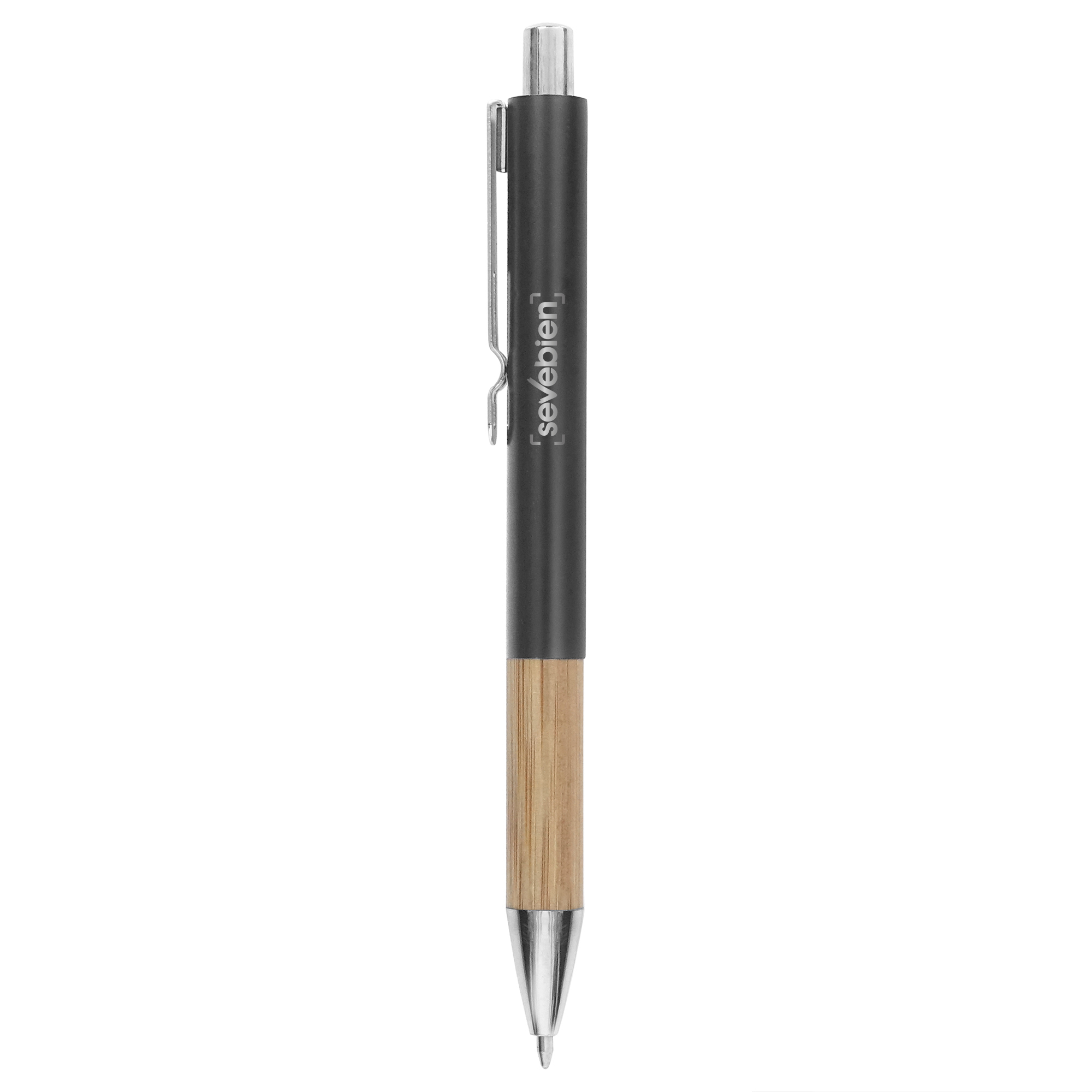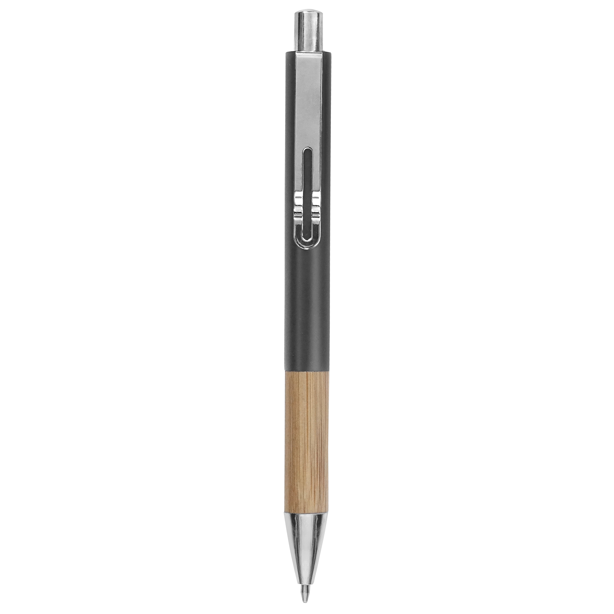 Metal. Cuerpo de aluminio en diferentes colores. Grip de bambú. Clip metálico. Pulsador y puntera plásticas color plata. Tinta negra. Decape color plata.