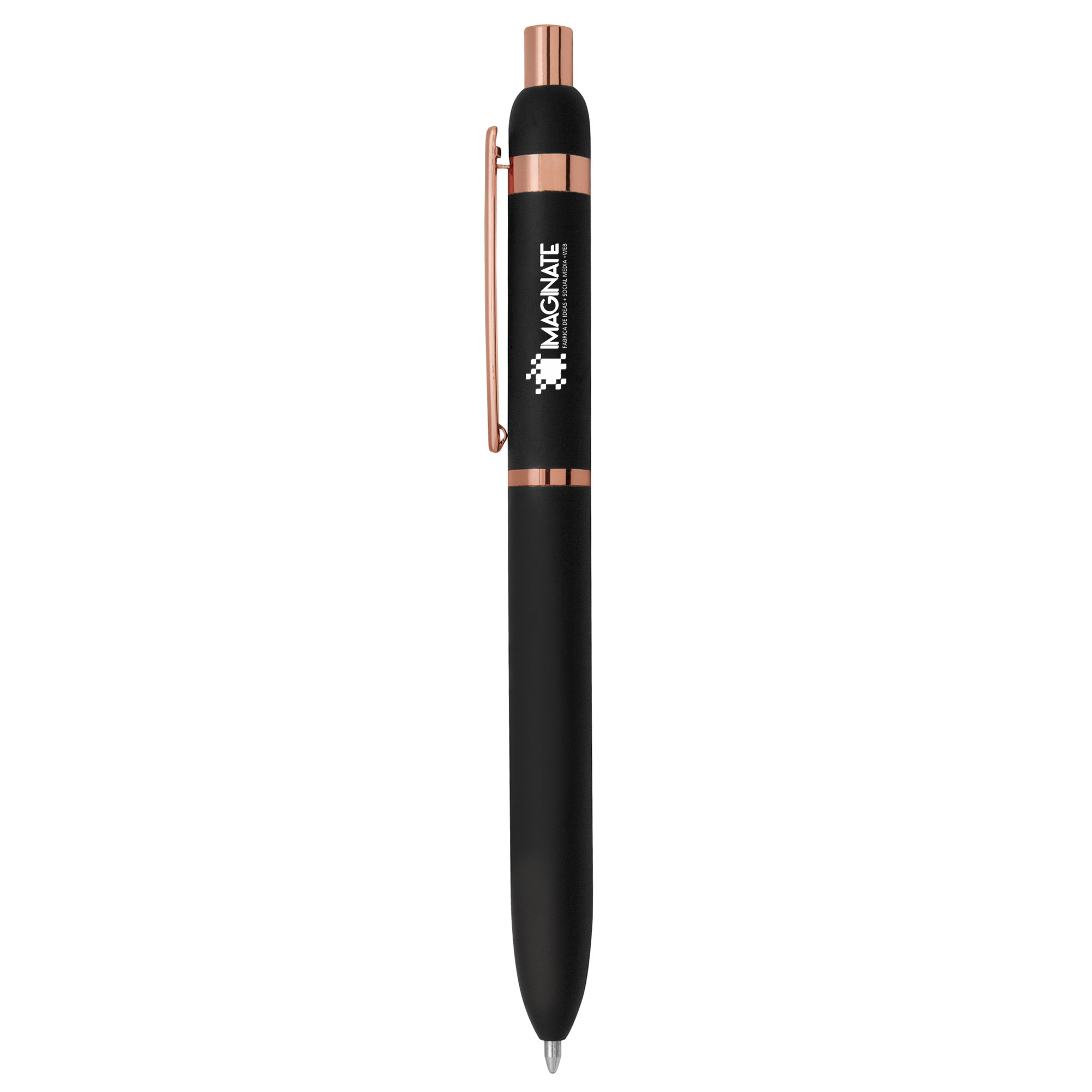 Metal. Cuerpo de aluminio, acabado engomado color negro, muy suave al tacto. Bolígrafo retráctil. Clip, botón y anillos metálicos color cobre. Tinta Azul. Decapa cobre tanto en el cuerpo como en la tapa (grabado exclusivo en nuestro taller). Presentación en caja de regalo.