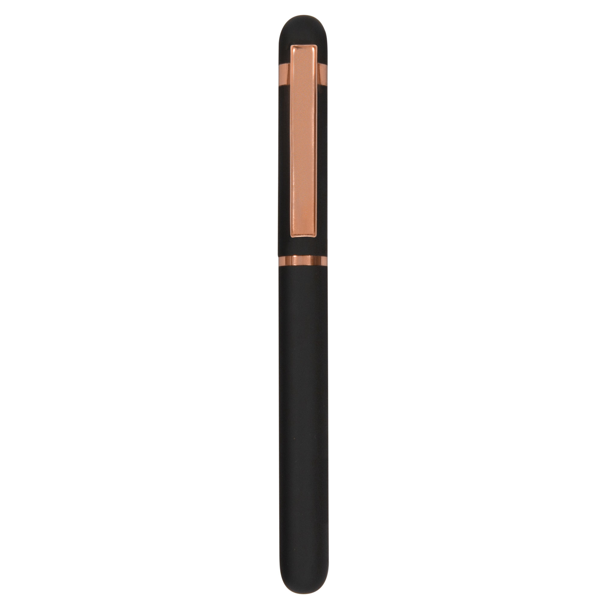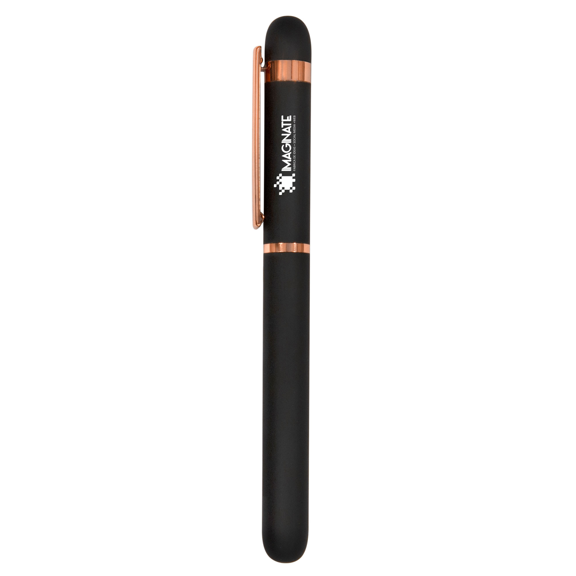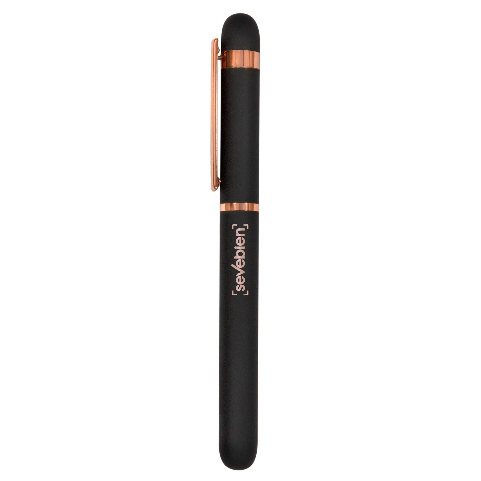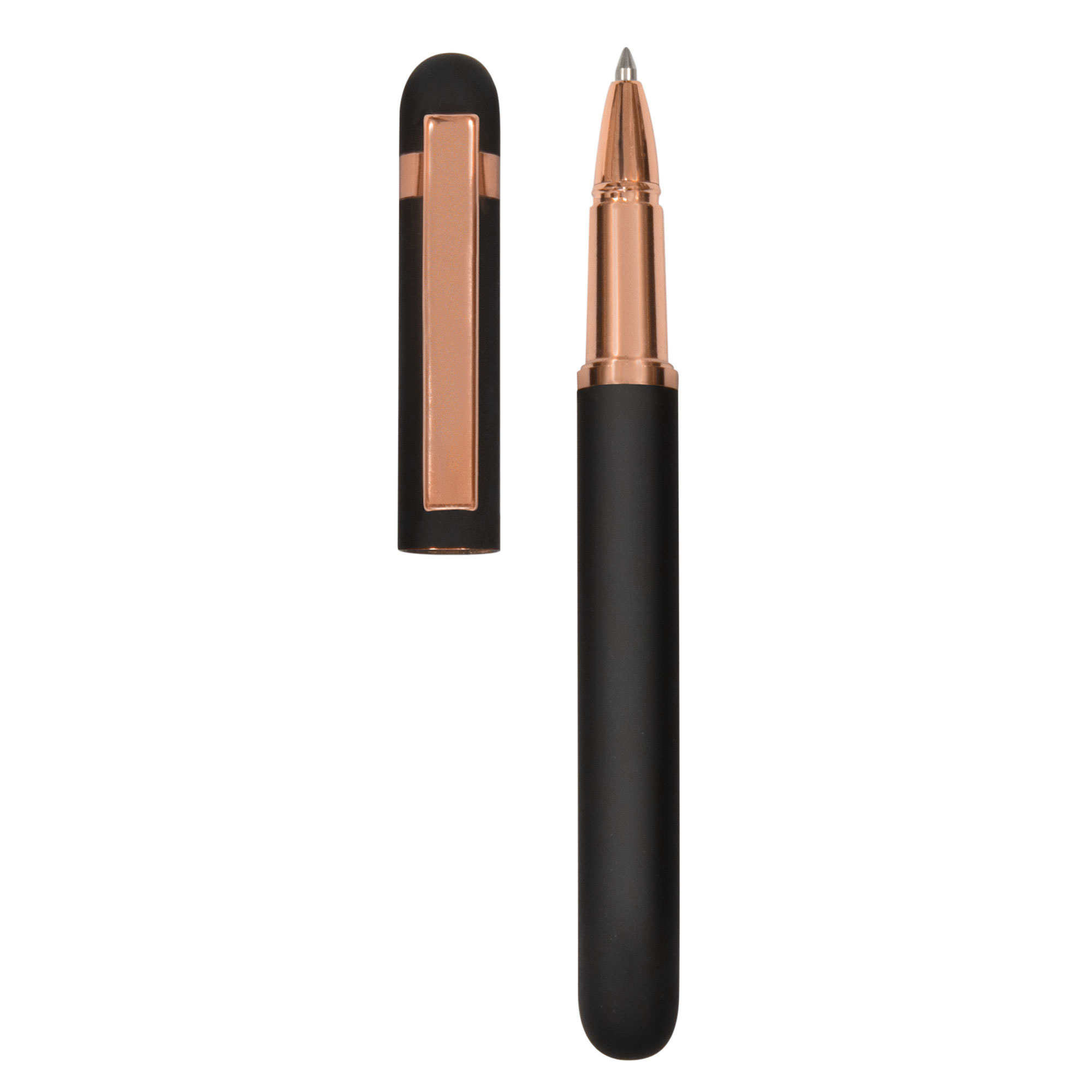 Metal. Cuerpo de aluminio, acabado engomado color negro, muy suave al tacto. Roller. Apertura con tapa a presión. Clip y anillos metálicos color cobre. Tinta Azul. Decapa cobre tanto en el cuerpo como en la tapa (grabado exclusivo en nuestro taller). Presentación en caja de regalo.