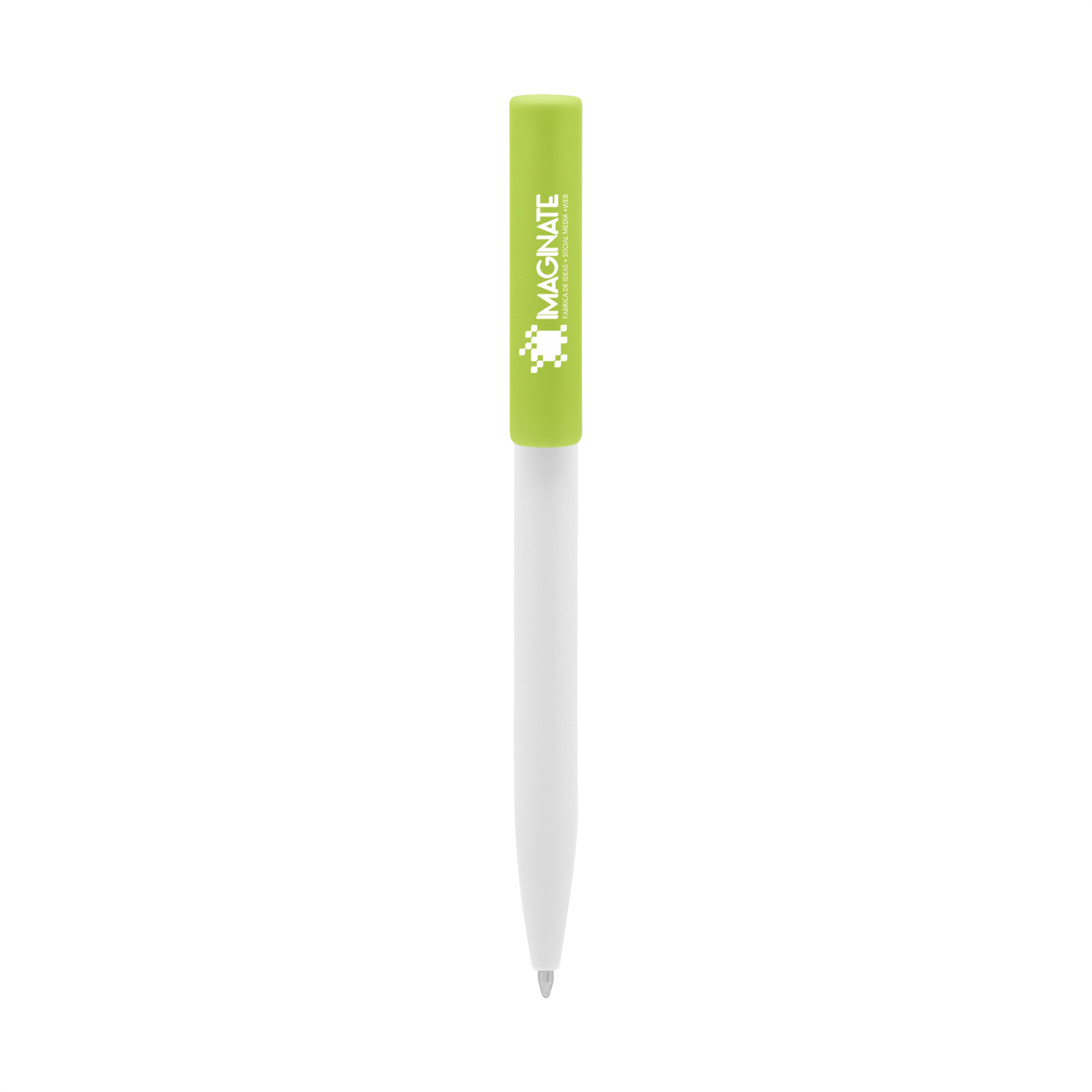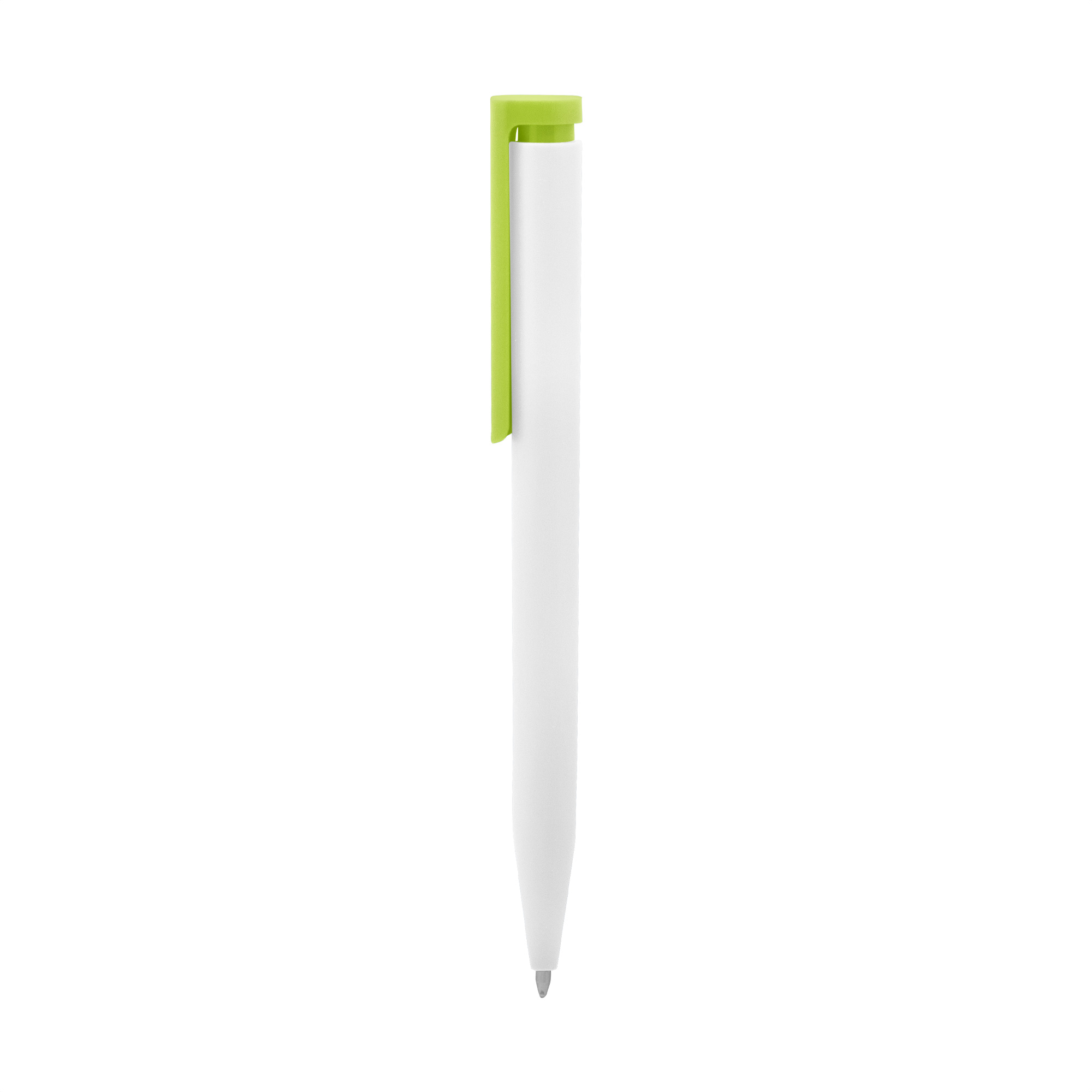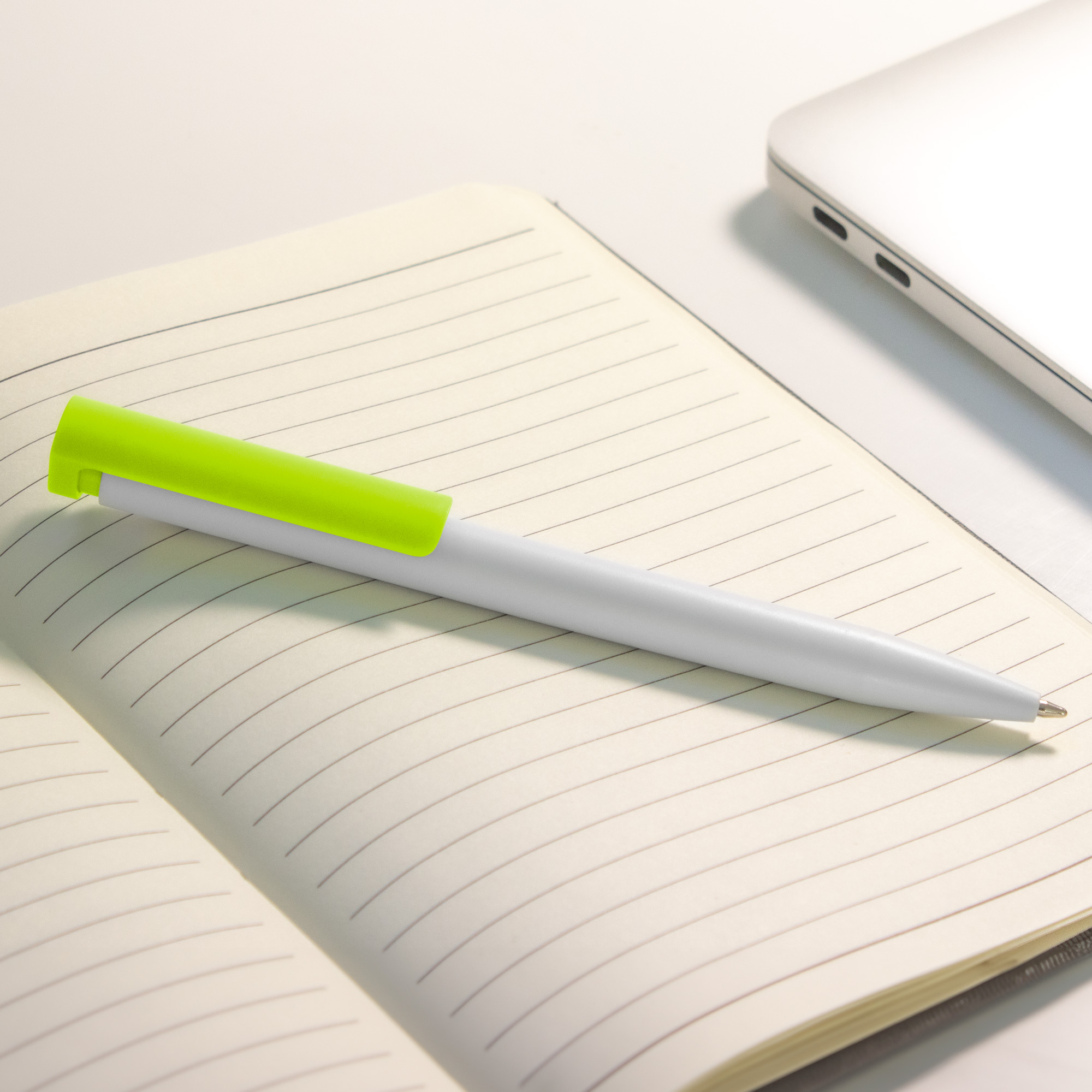 Plástico. Cuerpo blanco y clip de diferentes colores. Bolígrafo retráctil. Clip plástico de colores. Tinta negra. Sistema de botón push para destapar. Amplia área de impresión.