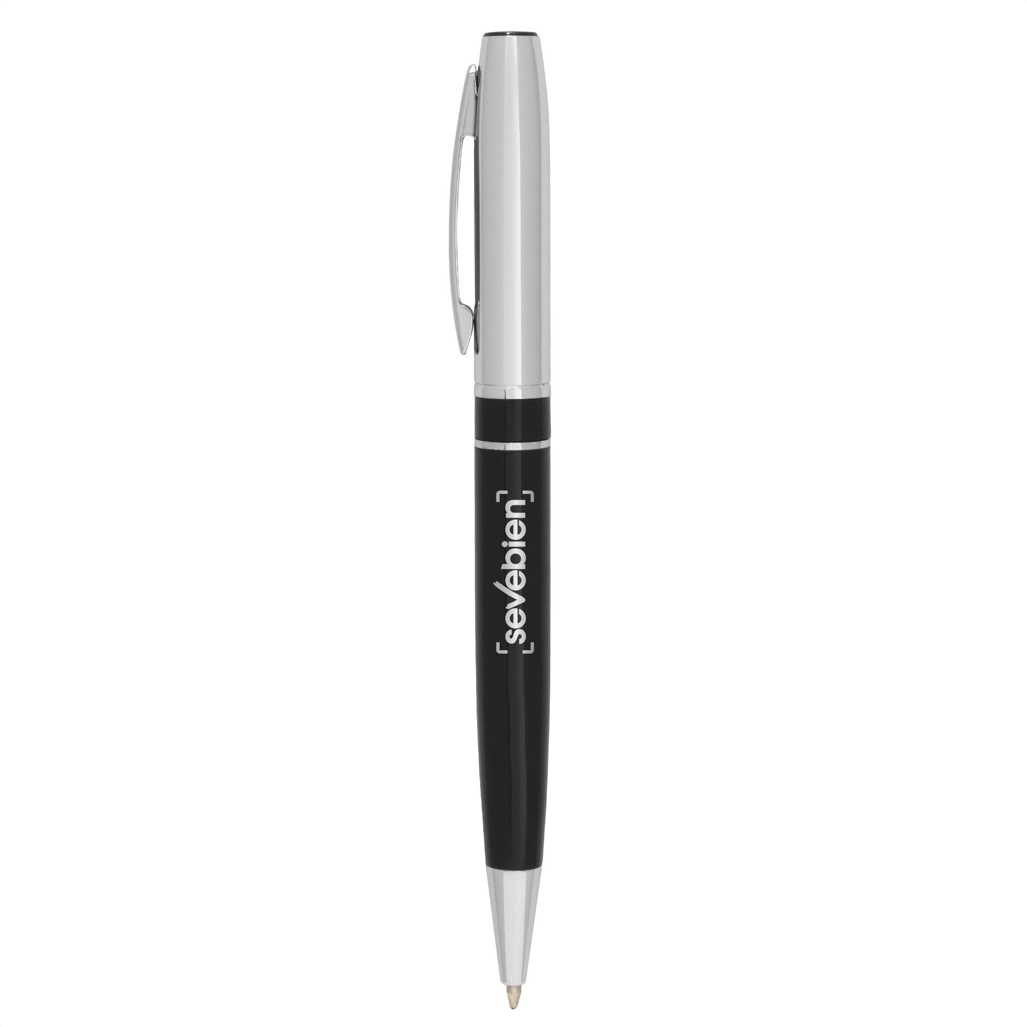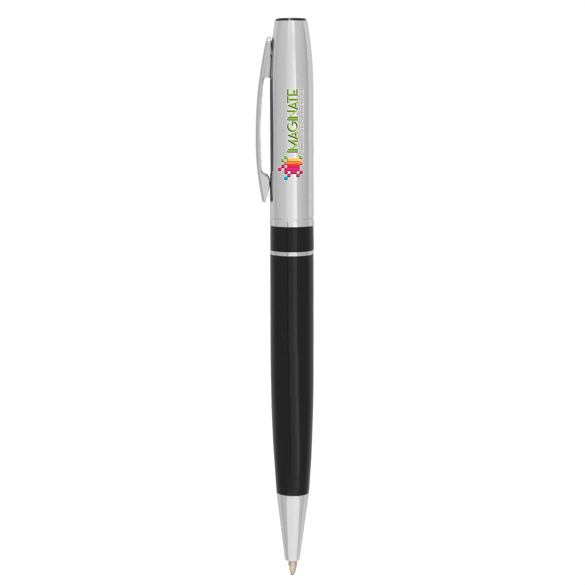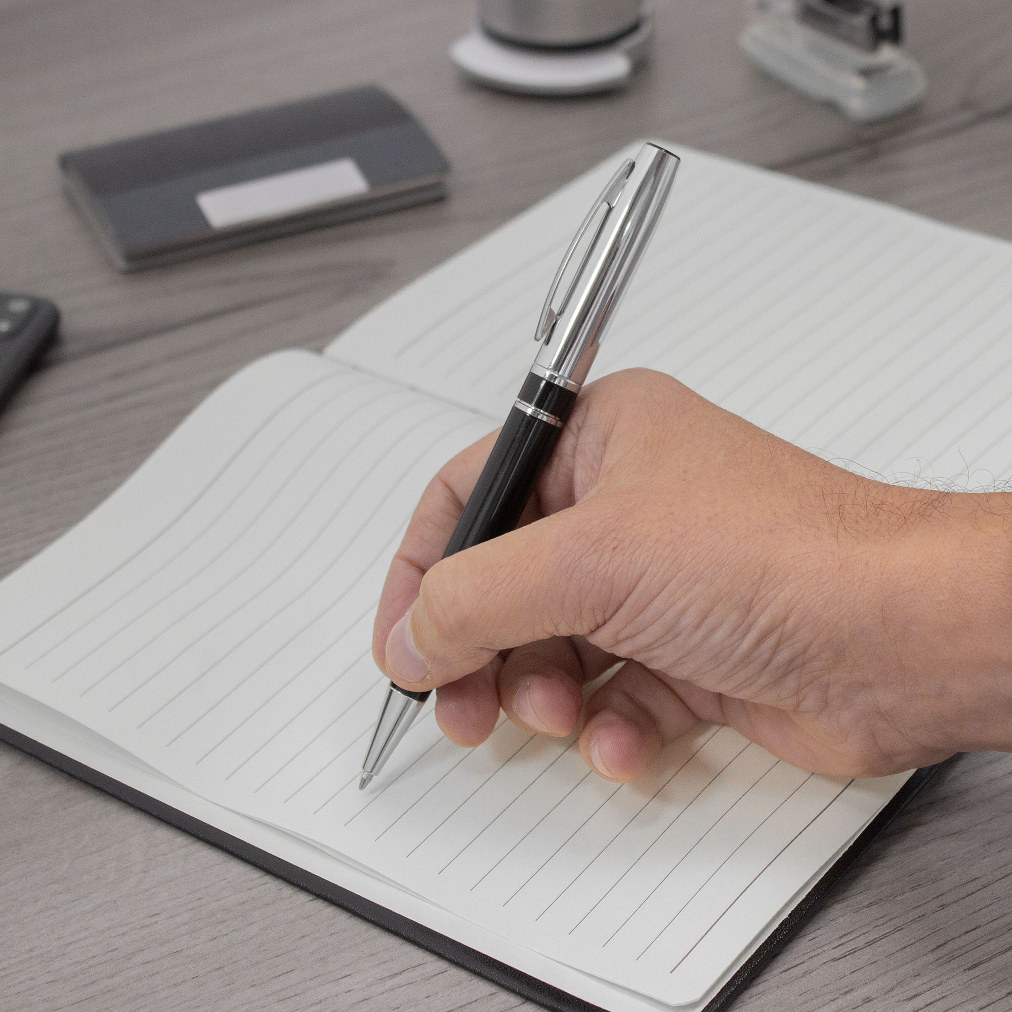 Estilo y Elegancia al Alcance de tu Mano. Bolígrafo con apertura giratoria. Cuerpo color negro. Tambor superior, clip, anillo y puntera color plata. Destape plata en la parte superior e inferior.