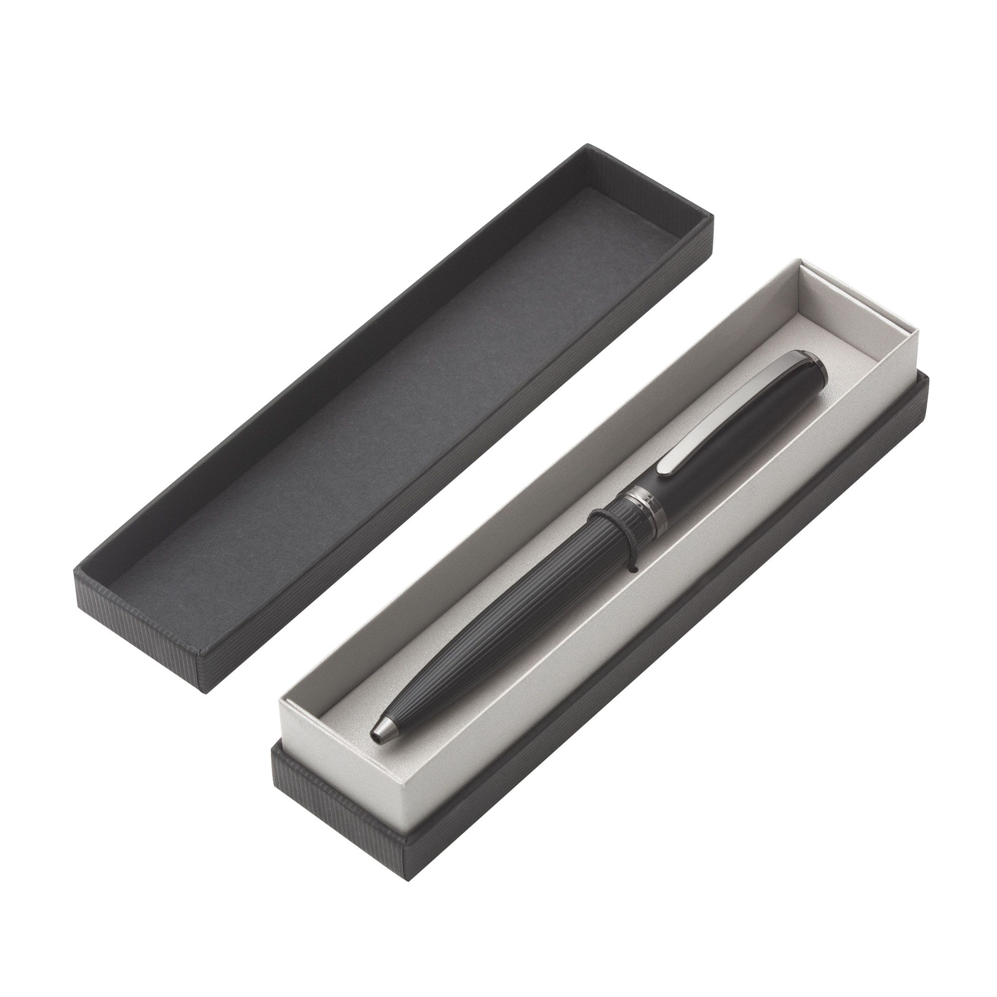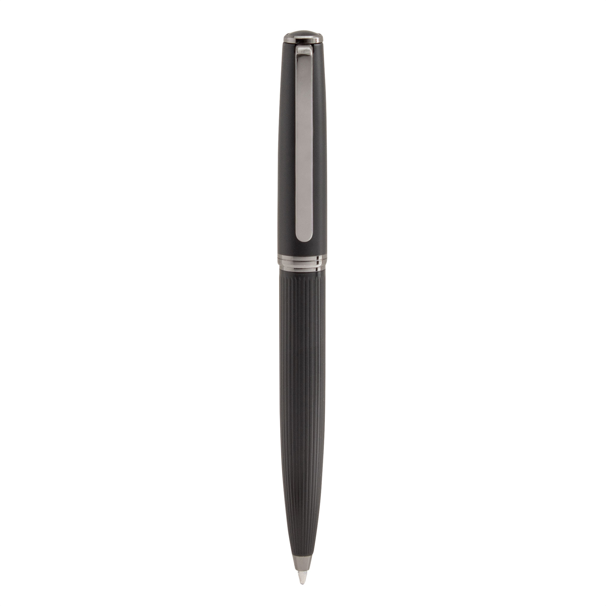 Metálico. Cuerpo color negro mate. Puntera, clip y anillo metálico. Apertura giratoria. En la parte superior destape electroplateado. Parte inferior texturada para mejor agarre. Tinta azul. Recarga metálica. Presentación en caja de regalo.