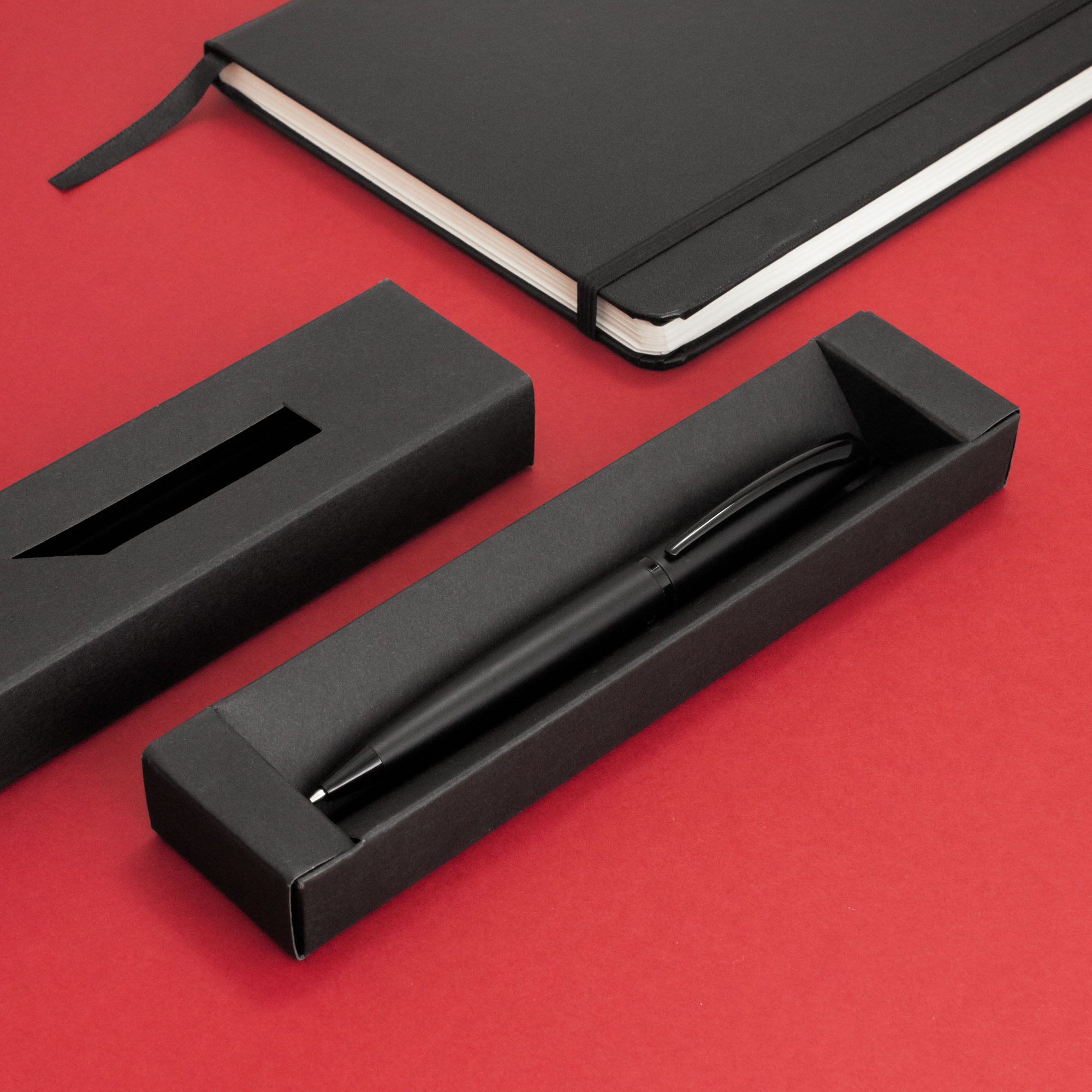 Metálico. Cuerpo de aluminio con acabado mate. Clip, anillo central y puntera de hierro con acabado brillante. Refill metálico de origen alemán. Tambor superior con revestimiento galvánico. Apertura giratoria. Tinta azul. Presentación en caja de regalo.