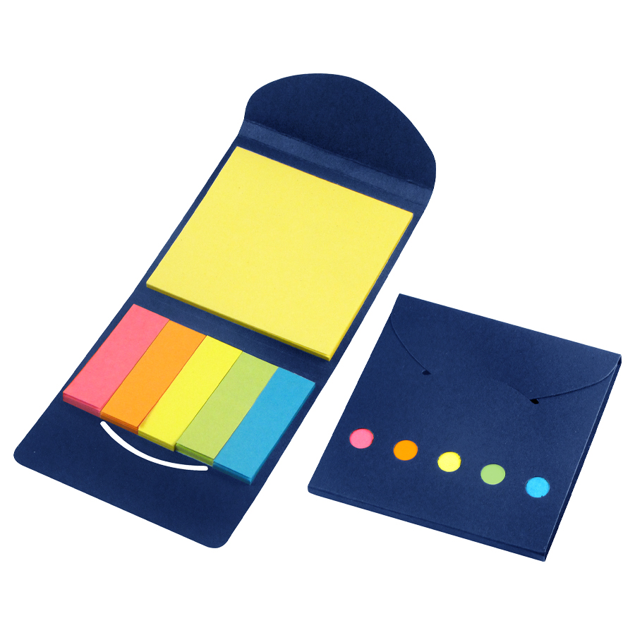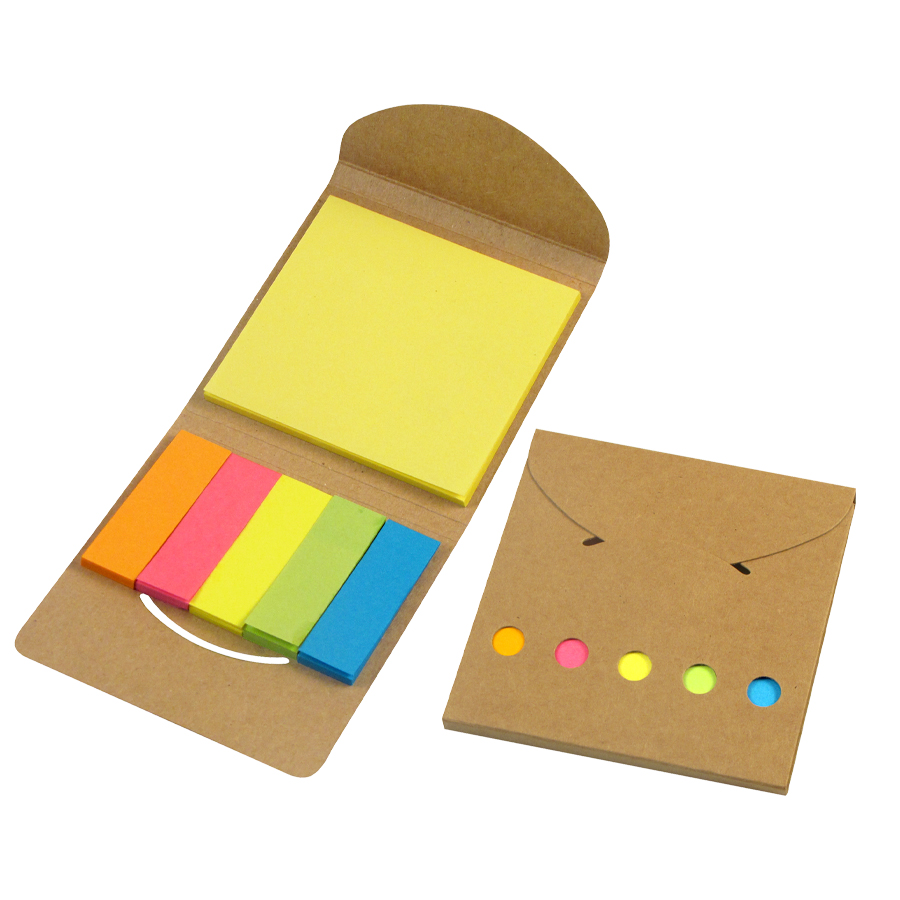 Funcional porta notas adhesivas ecológico, elaborado en cartón reciclado, perfecto para oficina, escritorio o regalo corporativo. Incluye un taco de notas adhesivas de 25 hojas (7,5 × 7,5 cm) y cinco tacos de banderitas adhesivas de colores (5 × 1,5 cm) para marcar, organizar y destacar tus apuntes.