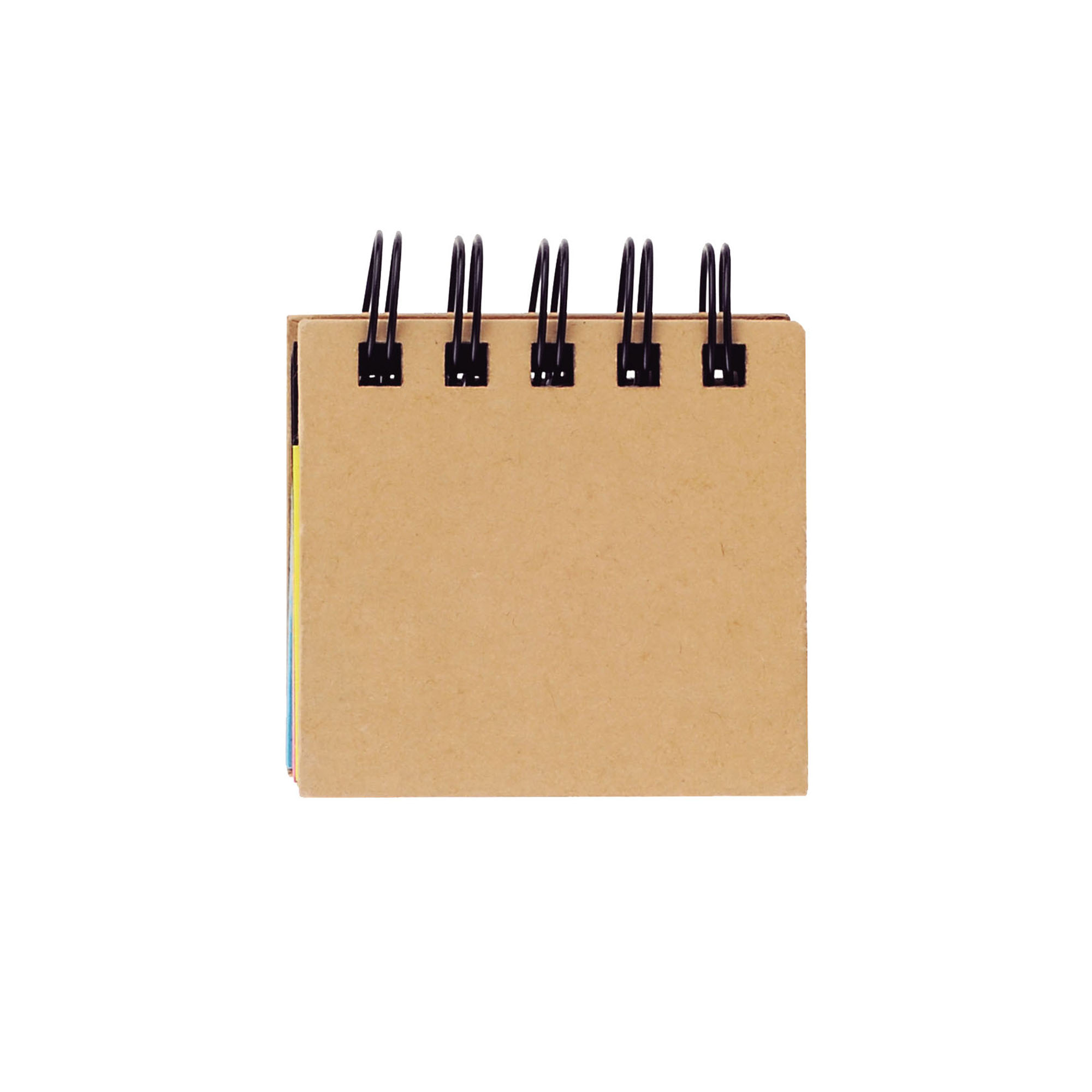 7,5 x 2 x 7 cm Cartón. Material reciclado. 5 blocs de 25 notas adhesivas rectangulares grandes. 5 blocs de 25 notas adhesivas rectangulares chicas estilo banderitas. Anillado metálico.