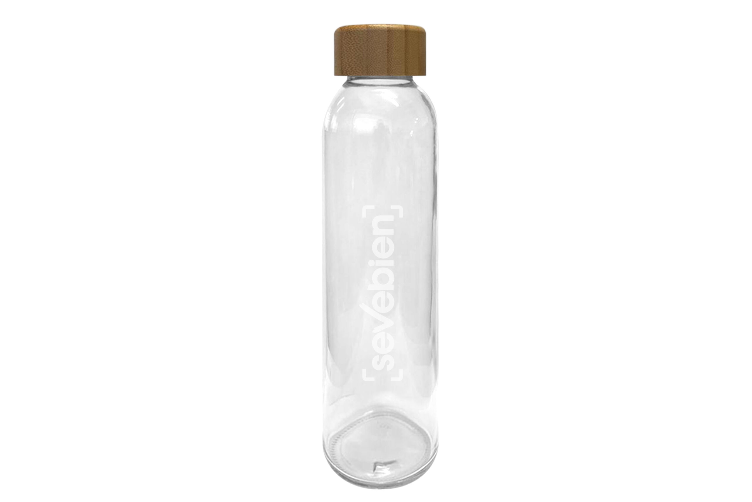 Ø 6,2 x 23 cm. Capacidad 500 ml. Vidrio resistente. Cuerpo traslúcido con tapa a rosca de bambú. Botella apta para microondas y lavavajillas, la tapa no puede ser expuesta a estos electrodomésticos.Presentación en caja de regalo Kraft