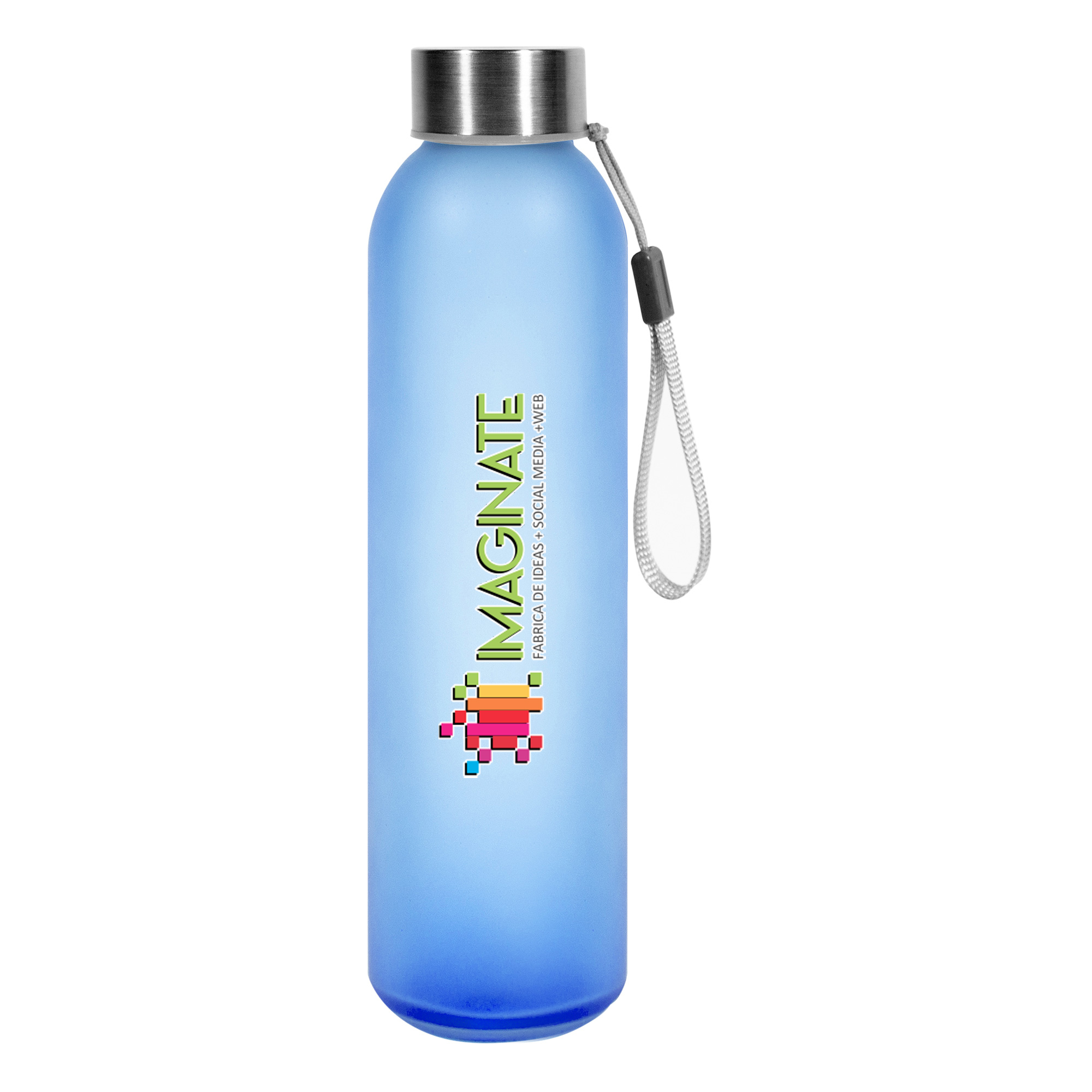 Ø 6,2 x 23 cm. Capacidad 500 ml. Vidrio. Botella de vidrio con acabado frosty. Tapa de acero inoxidable, aro de silicona antiderrame y correa de tela reforzada. Presentación en caja de regalo.