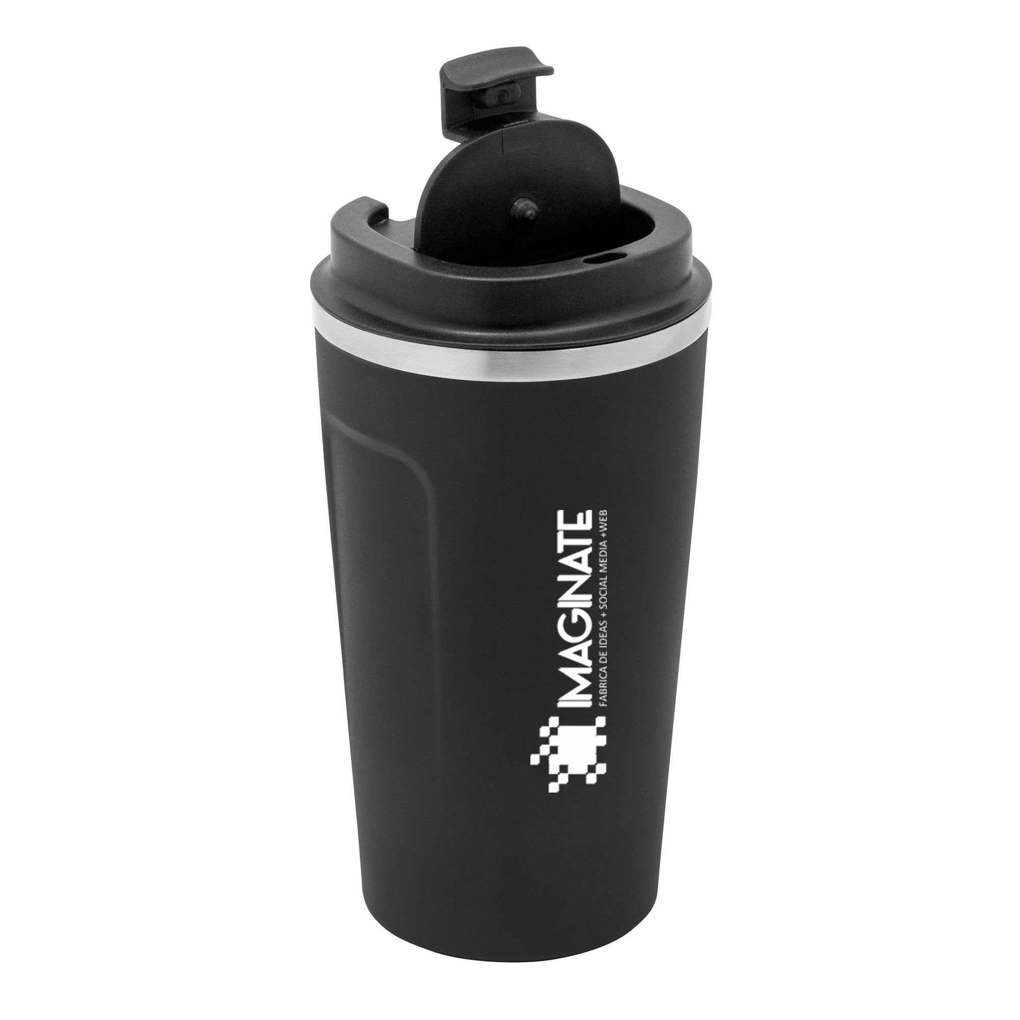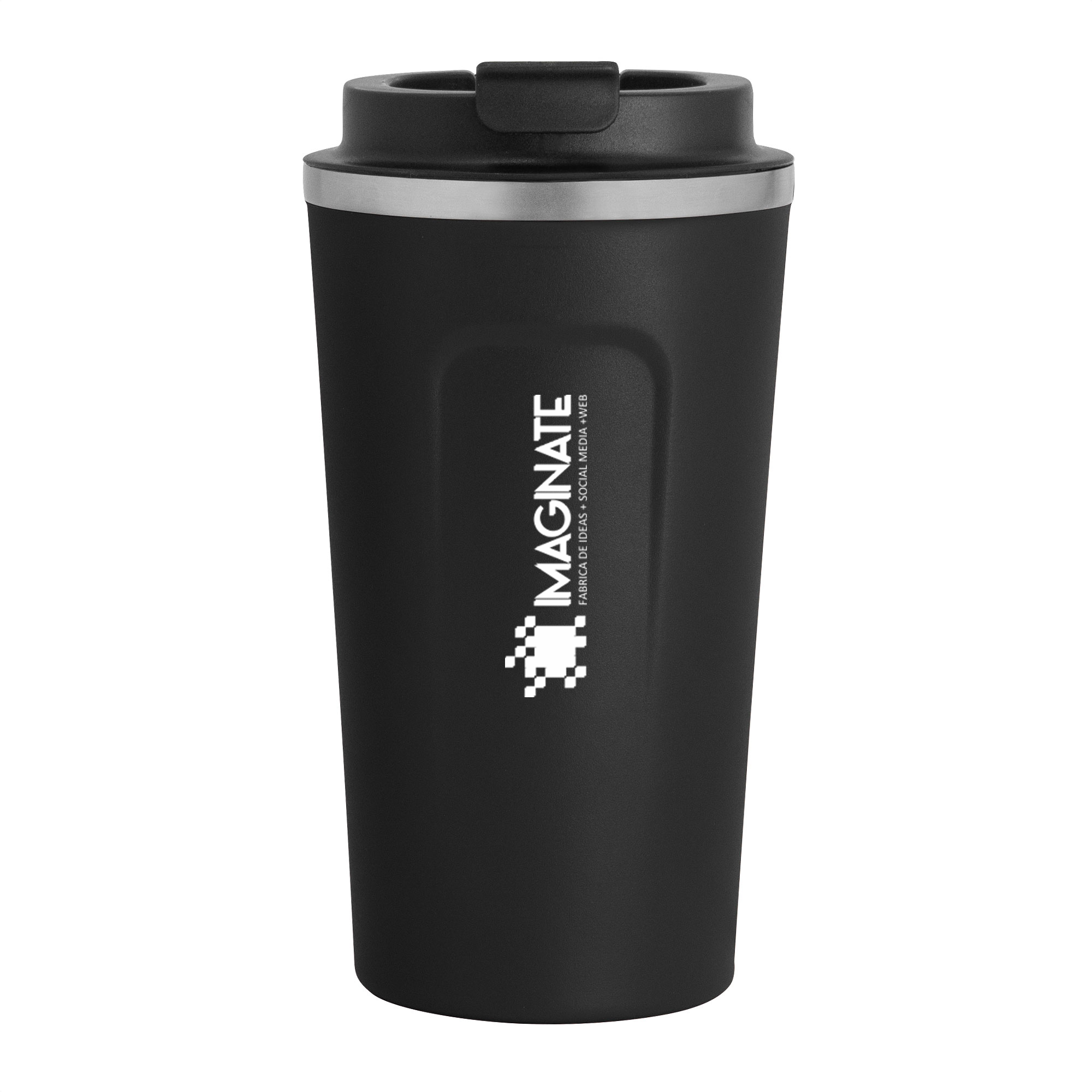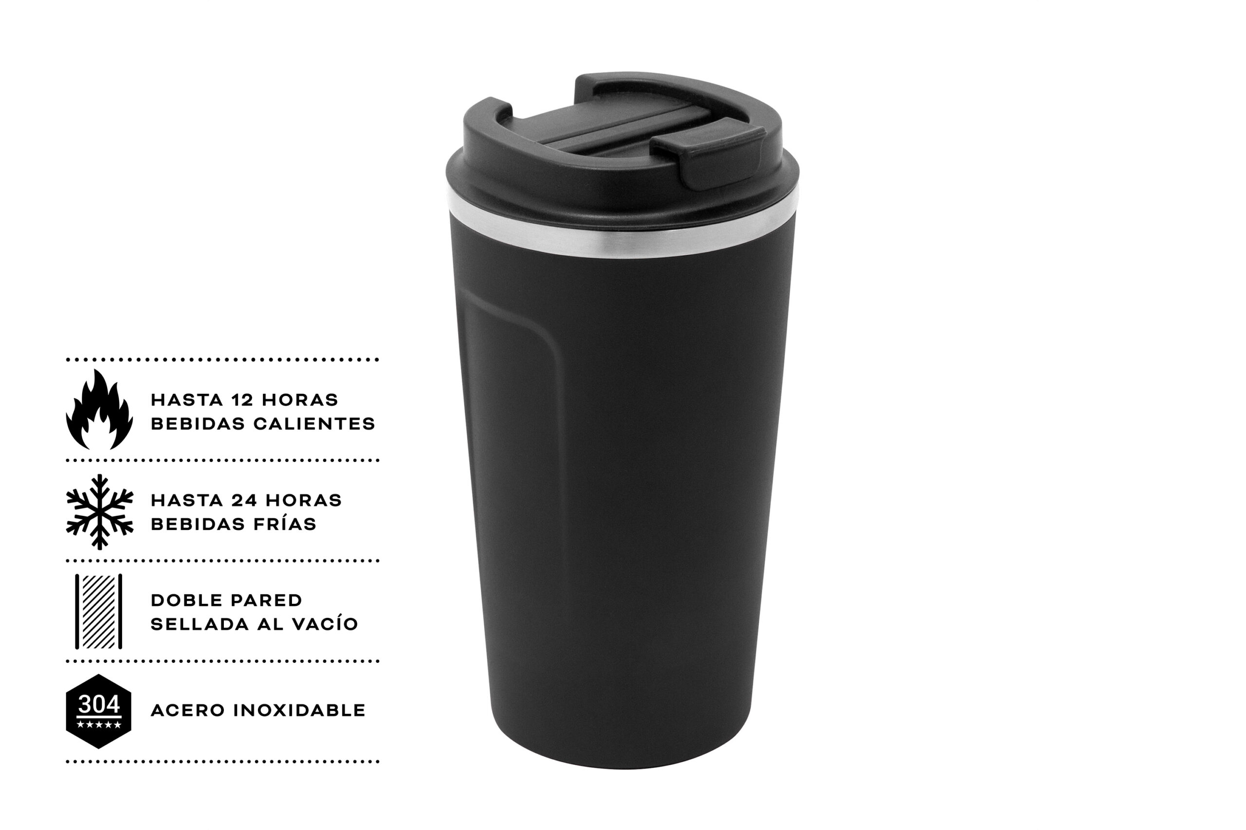 Ø 9 x 16,5 cm. Capacidad 500 ml. Acero Inoxidable. Mug doble pared, sellado al vacío. Interior acero 304 y exterior acero 201. Tapa plástica a rosca con seguro hermético antiderrame. Pintura Powder Coat (pintura mas duradera y resistente a la corrosión y el paso del tiempo).Mantiene hasta 12 hs la temperatura de las bebidas calientes y 24 hs de las bebidas frías. Presentación en caja de regalo.