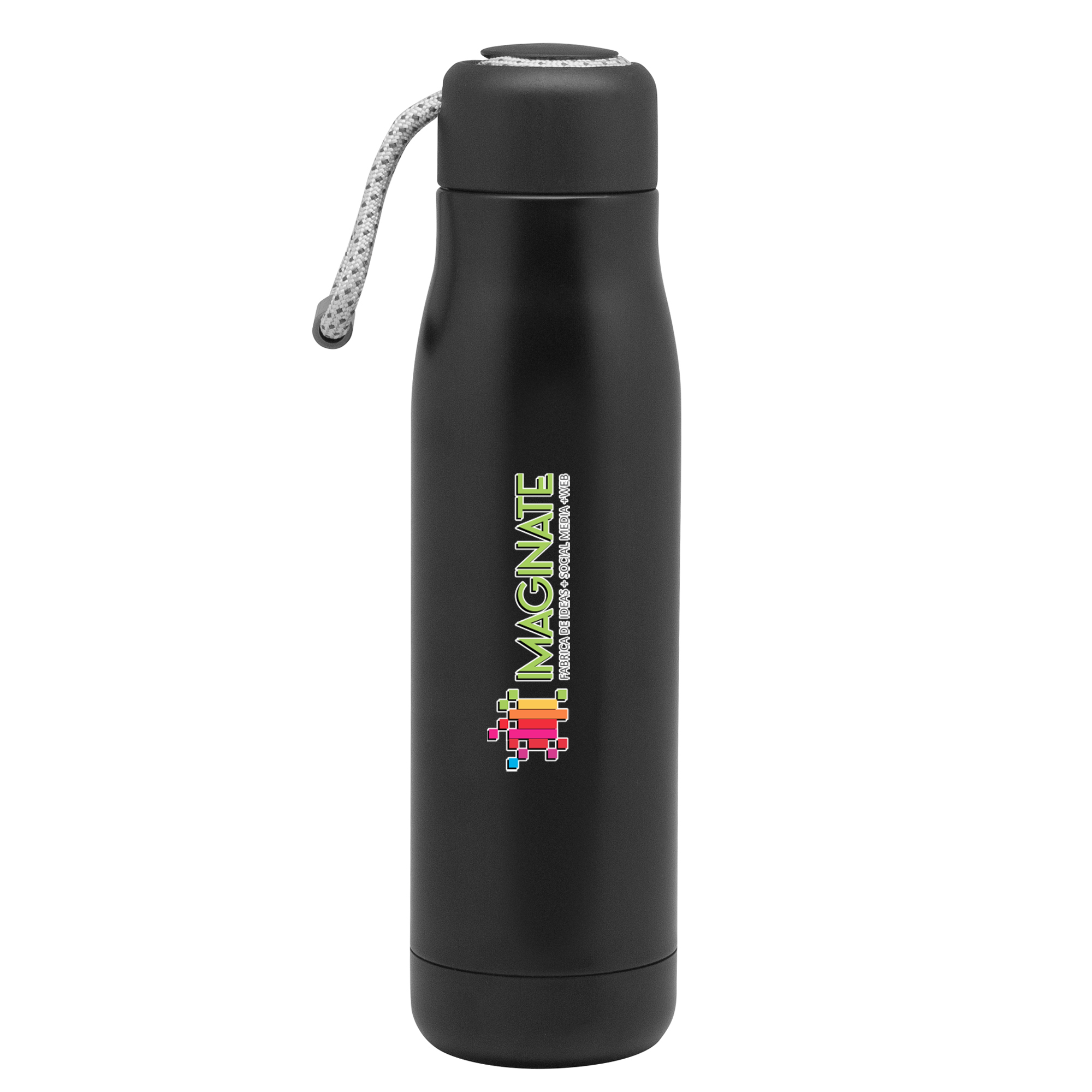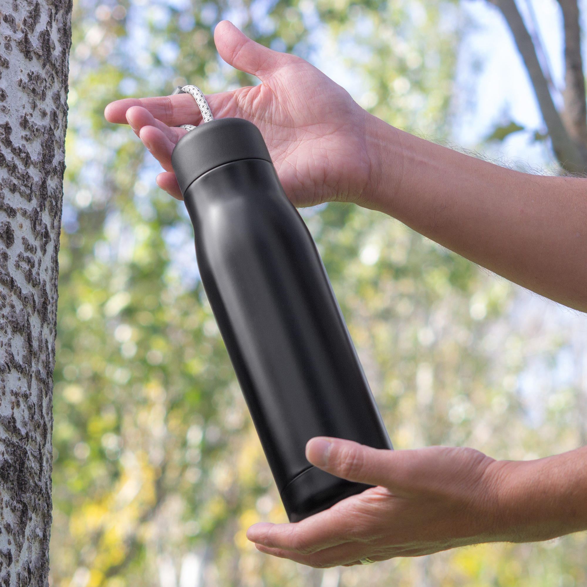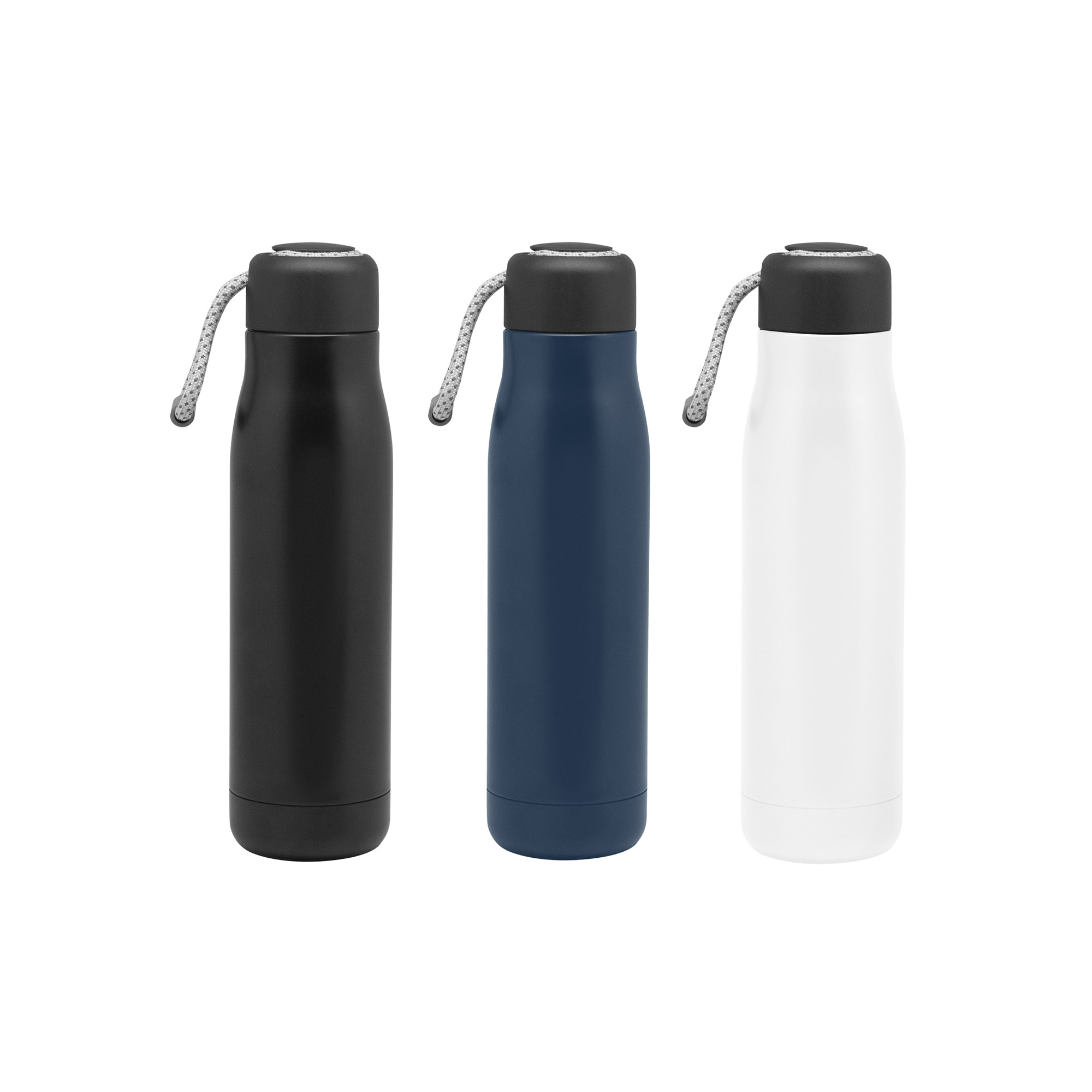 Lleva tus bebidas favoritas con la temperatura que te gusta. Botella doble pared, sellada al vacío. Interior de acero 304 y exterior de acero 201. Tapa plástica PP y anillo de silicona. Posee además tira de color gris de 12 cm de largo. Ideal para llevarla a todos lados. Mantiene hasta 12 hs la temperatura de las bebidas calientes y 24 hs de las bebidas frías. Medidas: Ø 7cm x 25.5 cm. Capacidad: 500 ml. Materiales: Acero inoxidable. Presentación: en caja de regalo Kraft.