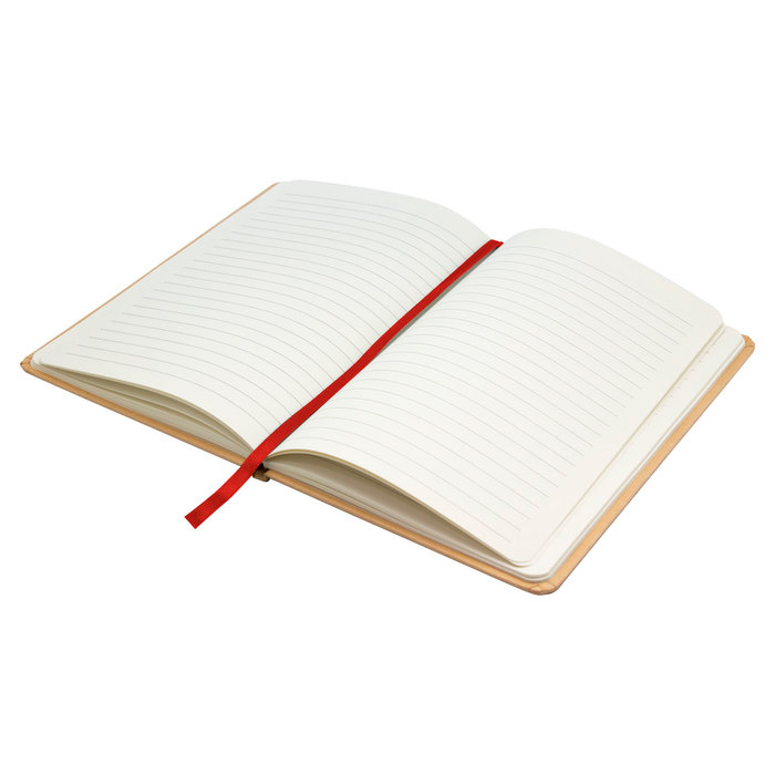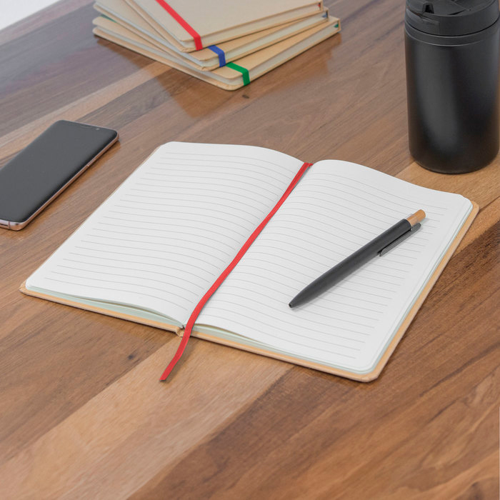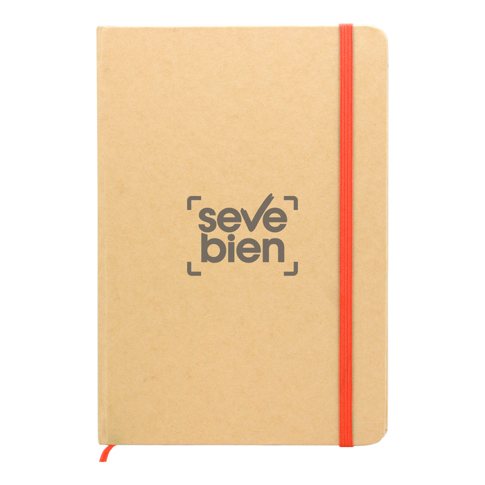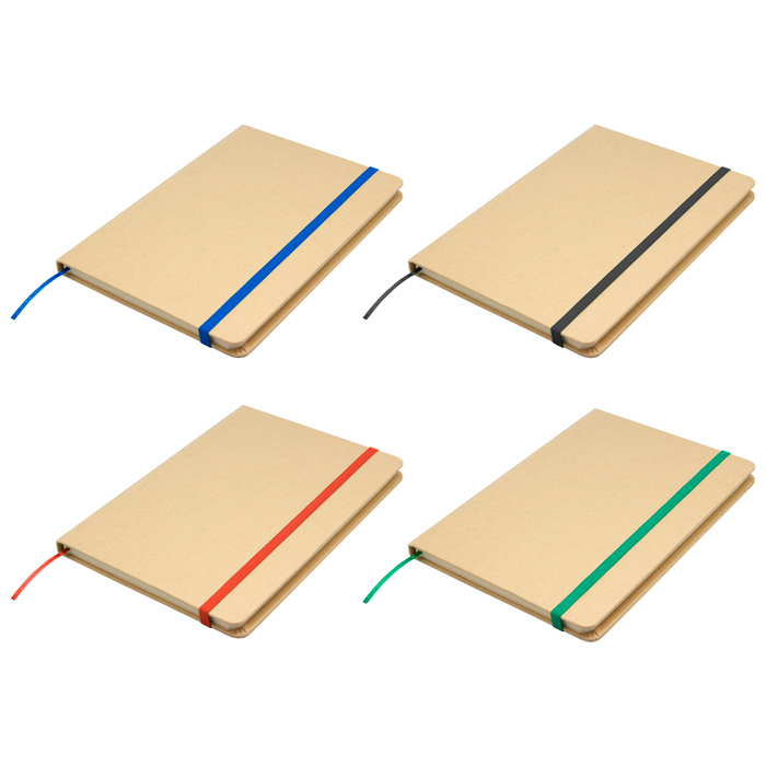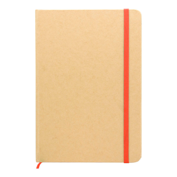 21 x 14 cm (A5). Cartón y Papel.. Libreta. Tapa en papel kraft. Interior 80 hojas rayadas en papel de 70 g. Cinta señaladora y cierre elástico del mismo color.