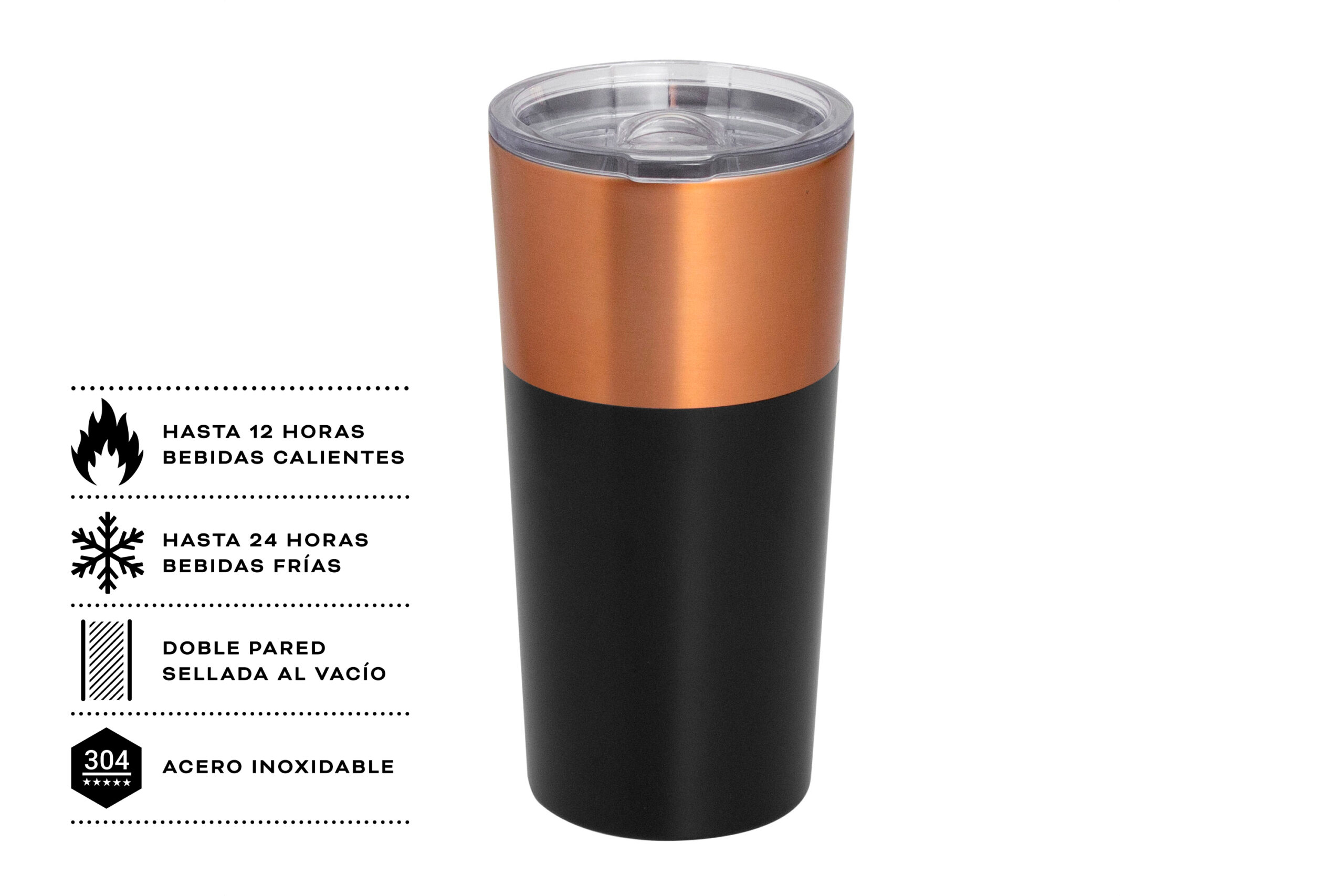 Ø 8,8 cm x 17,6 cm. Capacidad 600 ml. Acero inoxidable. Mug doble pared, sellado al vacío. Interior en acero 304 y exterior en acero 201. Tapa plástica transparente a presión con anillo de silicona. Pintura exterior con acabado mate en color negro y cobre. Mantiene hasta 12 hs la temperatura de las bebidas calientes y 24 hs de las bebidas frías. Presentación en caja de regalo Kraft.
