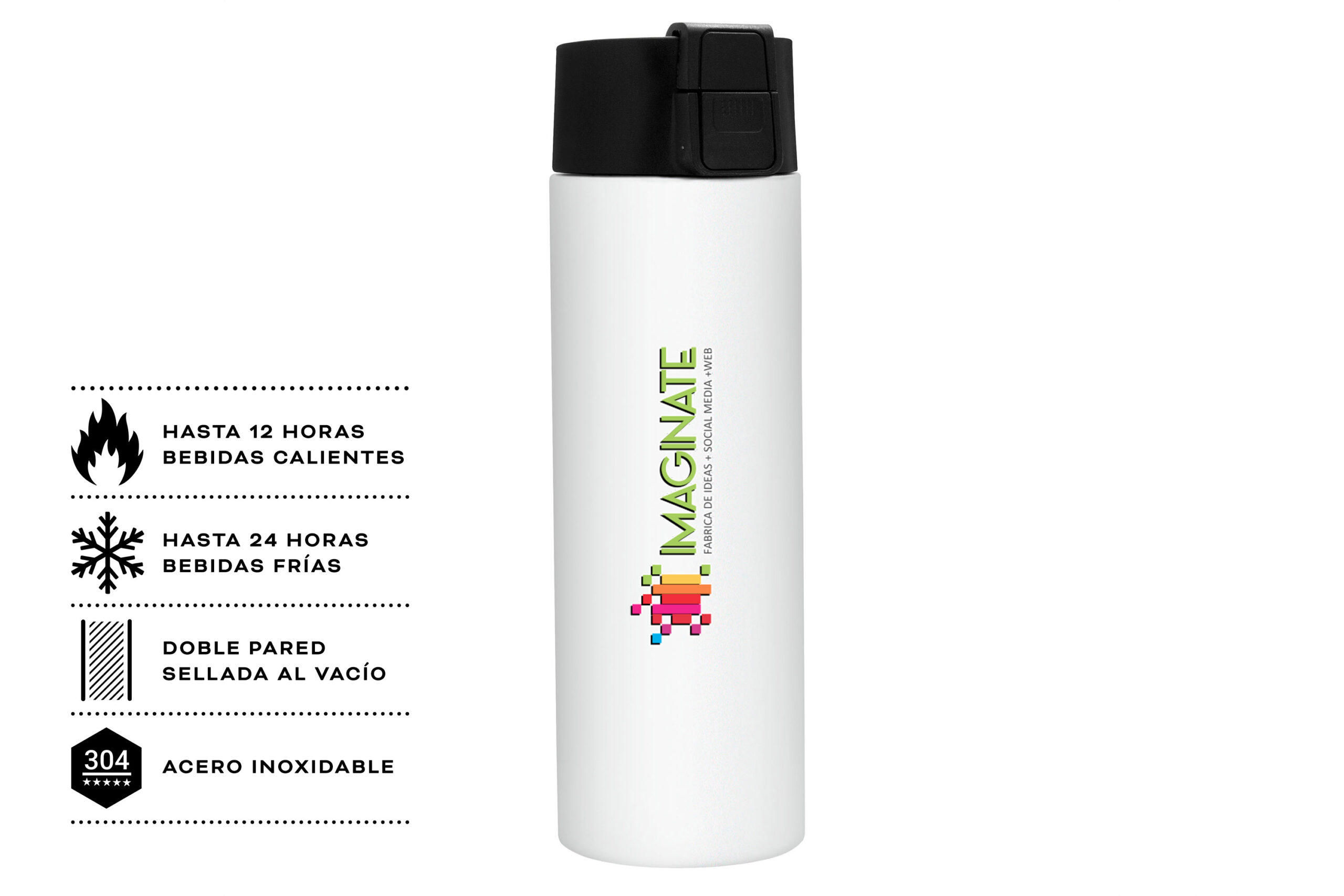Ø 7 cm x 23 cm. Acero inoxidable. Capacidad 450 ml. Botella doble pared, sellada al vacío. Interior de acero 304 y exterior de acero 201. Pintura color blanco brillante apta para sublimado. Tapa en PP con traba de seguridad y botón pulsador de apertura. Mantiene por más de 12 hs la temperatura de las bebidas calientes y 24 hs de las bebidas frías. Presentación en caja de regalo kraft.