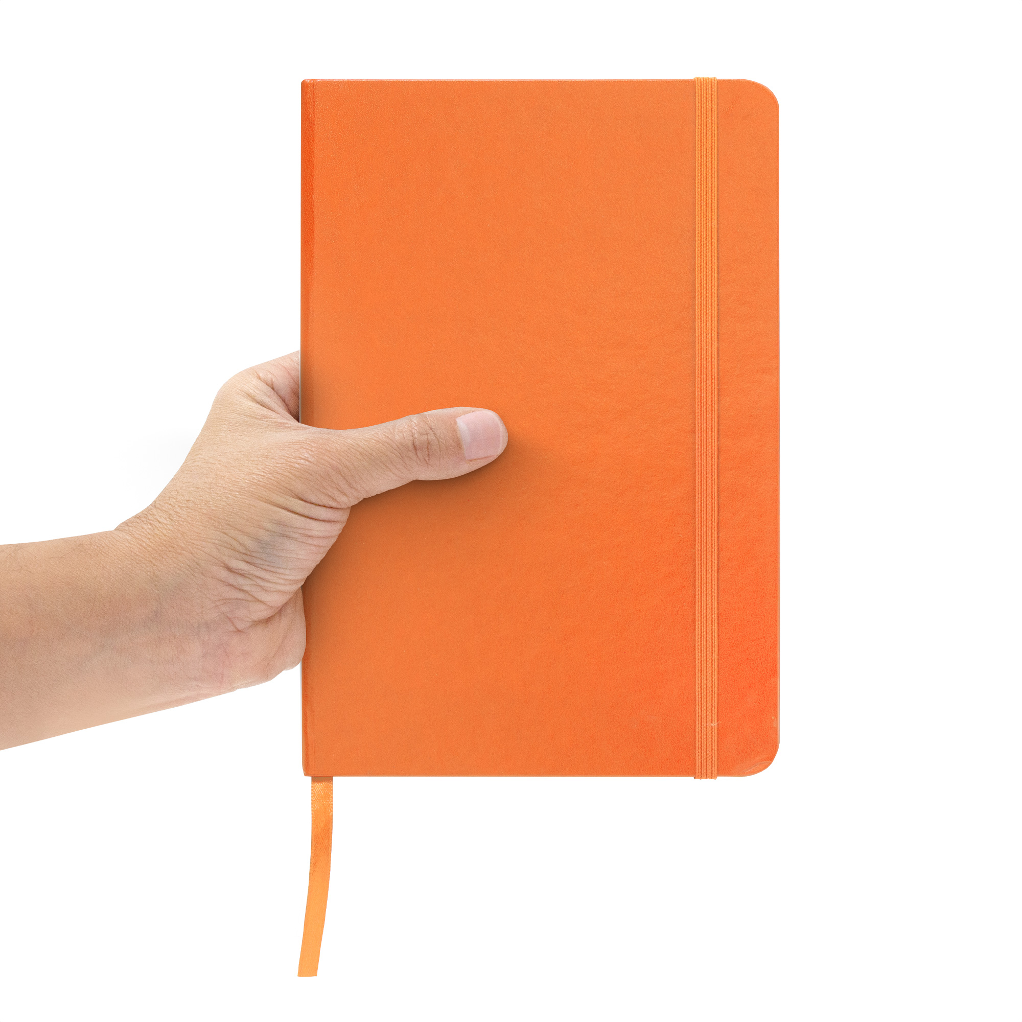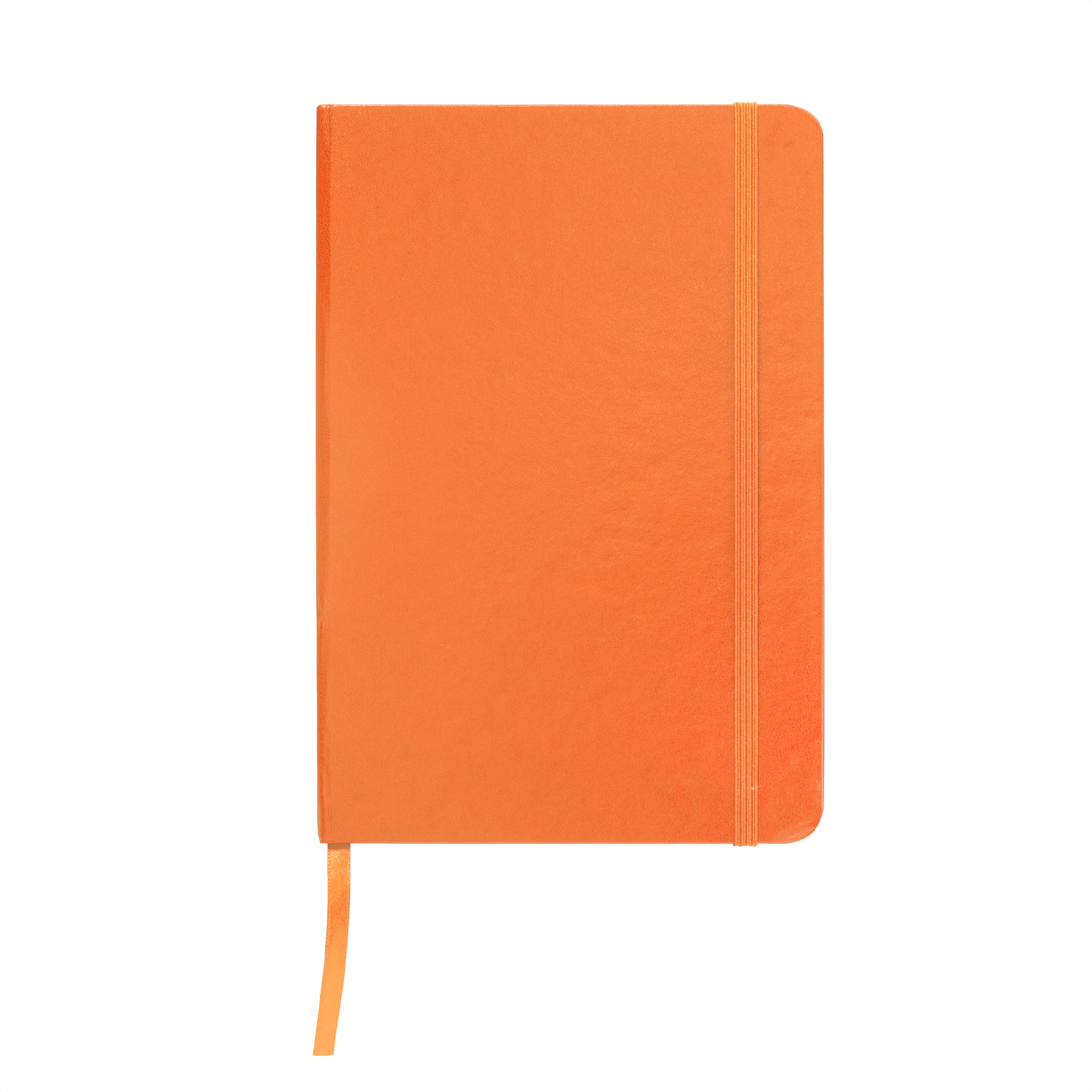 Libreta A5 con tapa de cartón de 300g recubierta en PU. Interior de 80 hojas rayadas en papel obra crema de 80g. Cierre con banda elástica y cinta señaladora del color de la tapa. Material: papel, cartón y poliuretano.