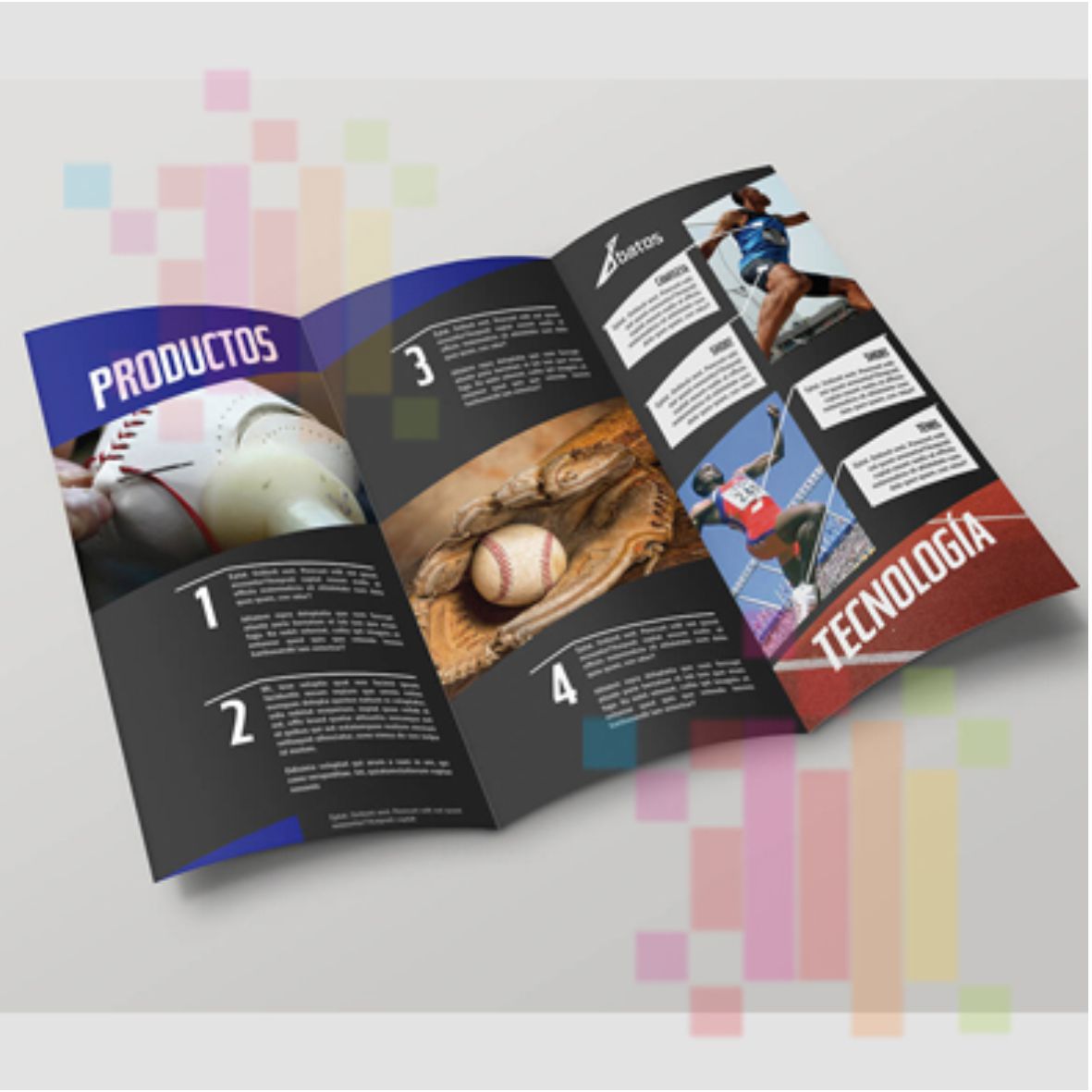 Tríptico en papel Couche o Bond, tamaño según solicitud. Incluye diseño e impresión por ambas caras. Ideal para brochures y presentaciones corporativas.